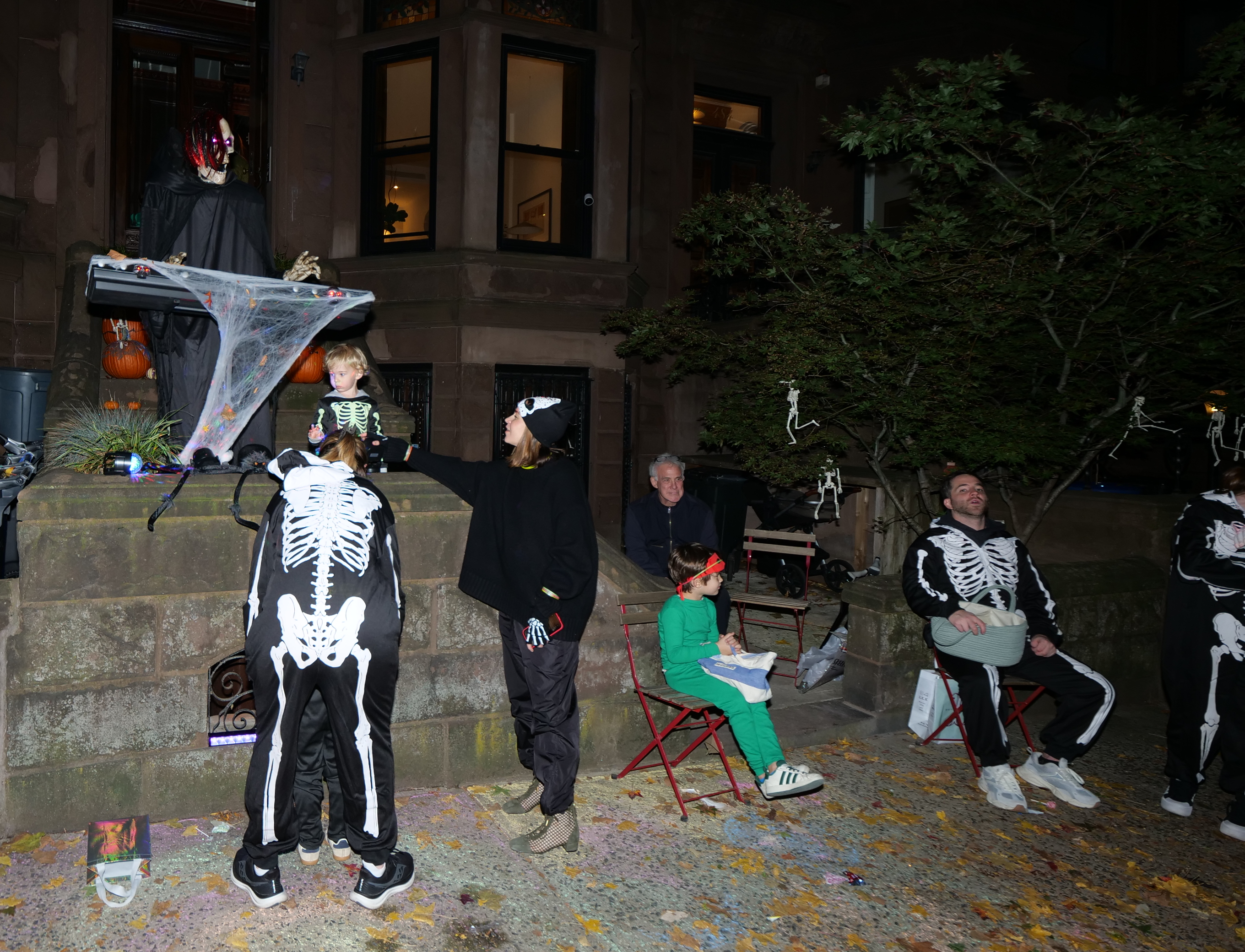 6:36 PM. A few houses down the block. The zombie organ player on the stoop moves his arms and jaws. His eyes light up. He plays whatever music the owner puts into it.