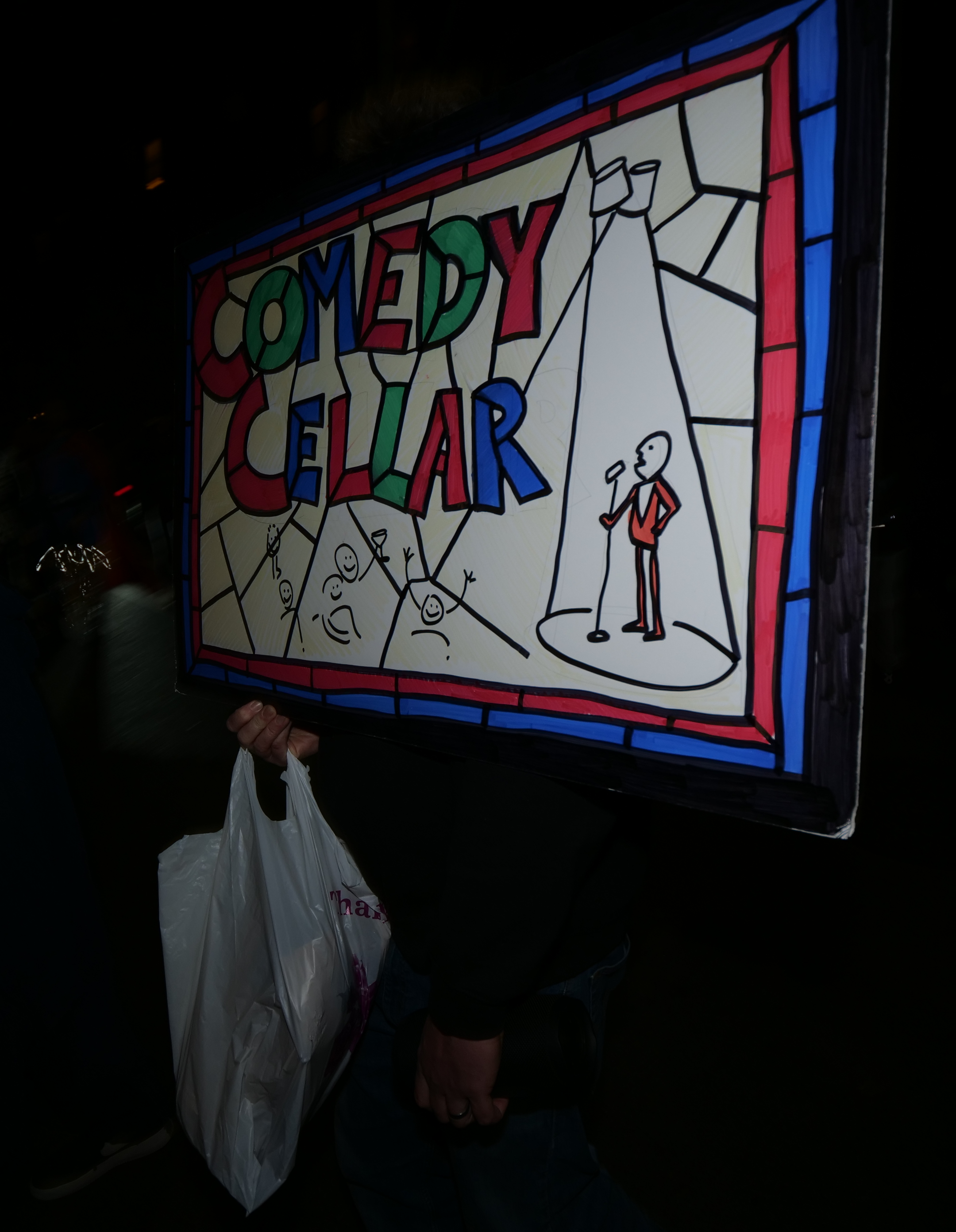 7:03 PM. A banner for Comedy Cellar, on MacDougal Street in Manhattan.