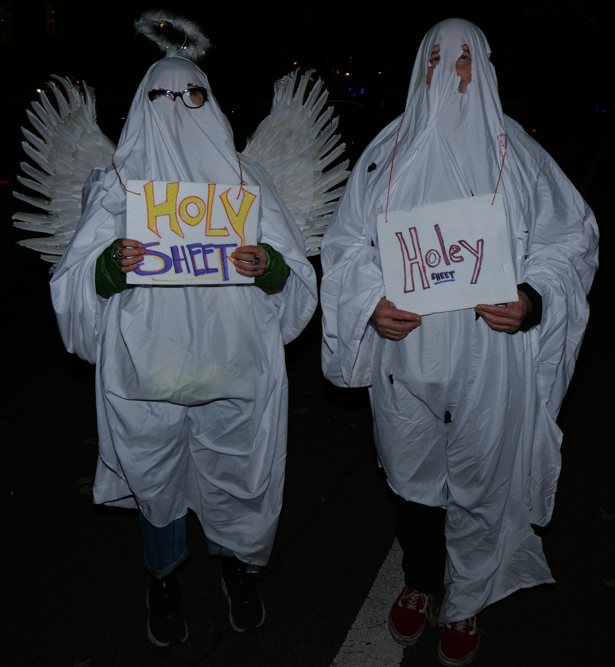 7:30 PM. A Holy Sheet (and angel) and a holey sheet (full of holes). There was a third, but it was now past his bedtime.
