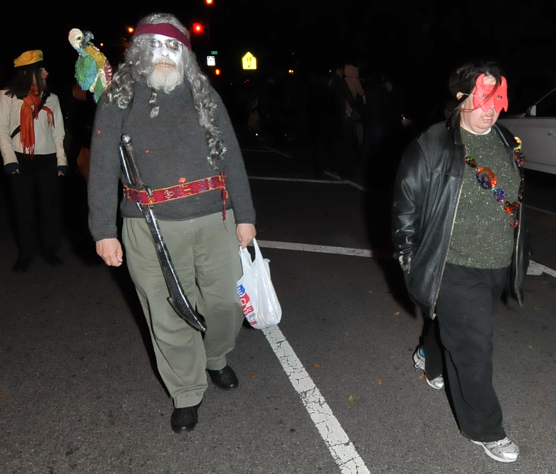 7:10 PM. A pirate with a parrot on his shoulder. At right, a devil's eye mask.