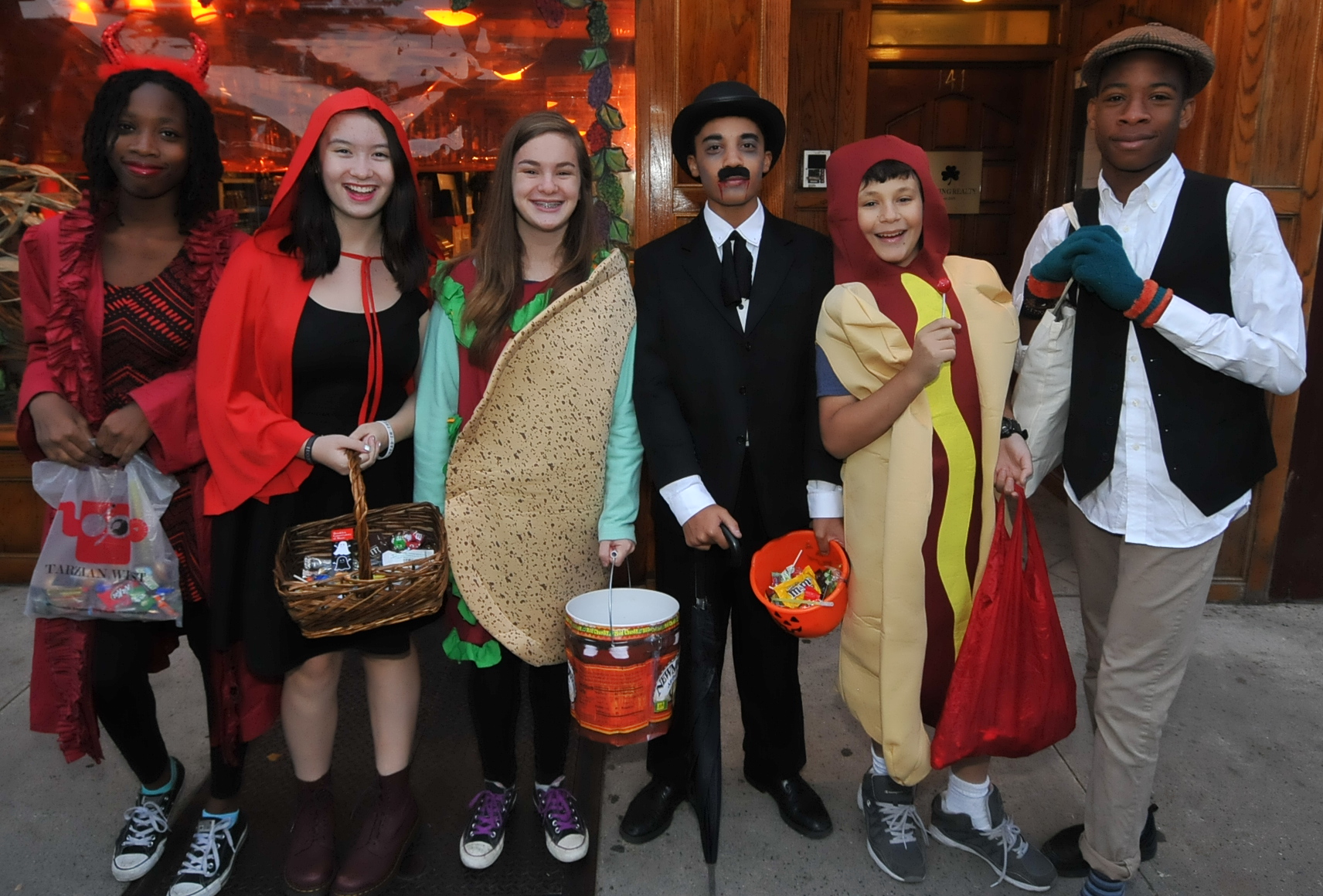 5:37 PM. A devil, Little Red Riding Hood, a Rasta Imposta taco costume, Charlie Chaplin, a hot dog costume, and ?.