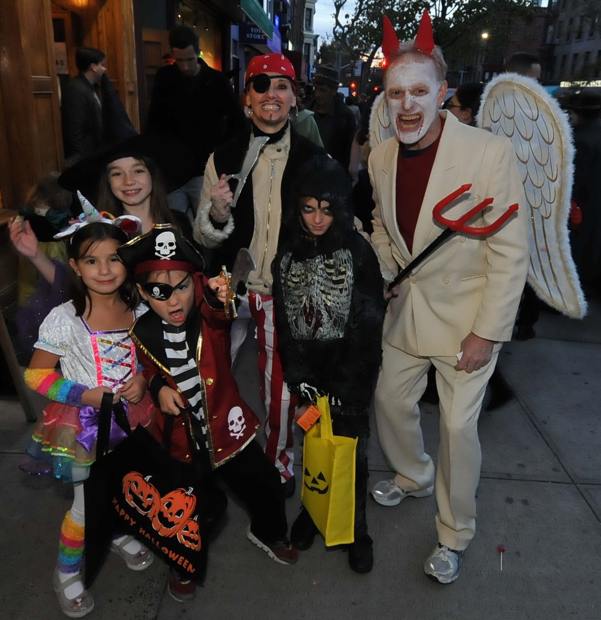 5:55 PM. A Rainbow Unicorn costume, a little pirate, a big pirate, a skeleton zombie, and the devil in an angel costume.