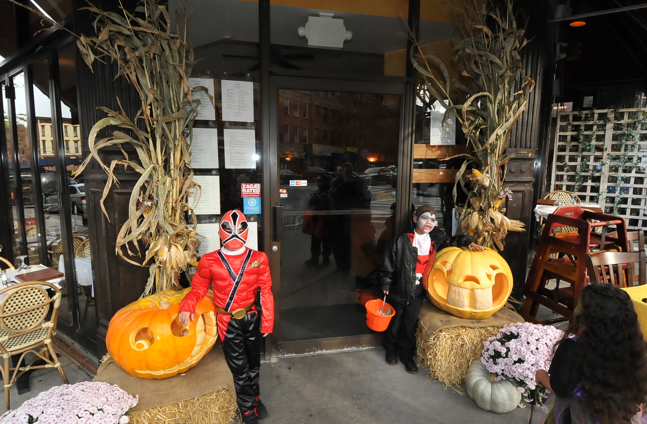 's jack-o'-lanterns. One is a Power Rangers Samurai Red Ranger costume, and the other a Dracula or vampire.