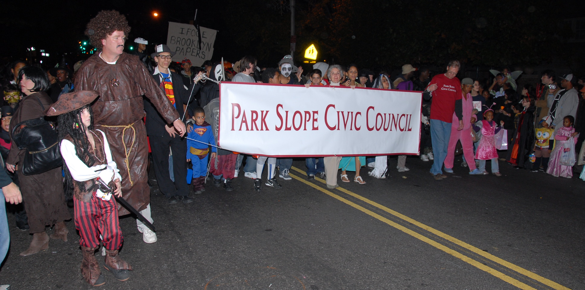 7:16 PM. Park Slope Civic Council banner. The sponsors of this event. A little pirate at left.