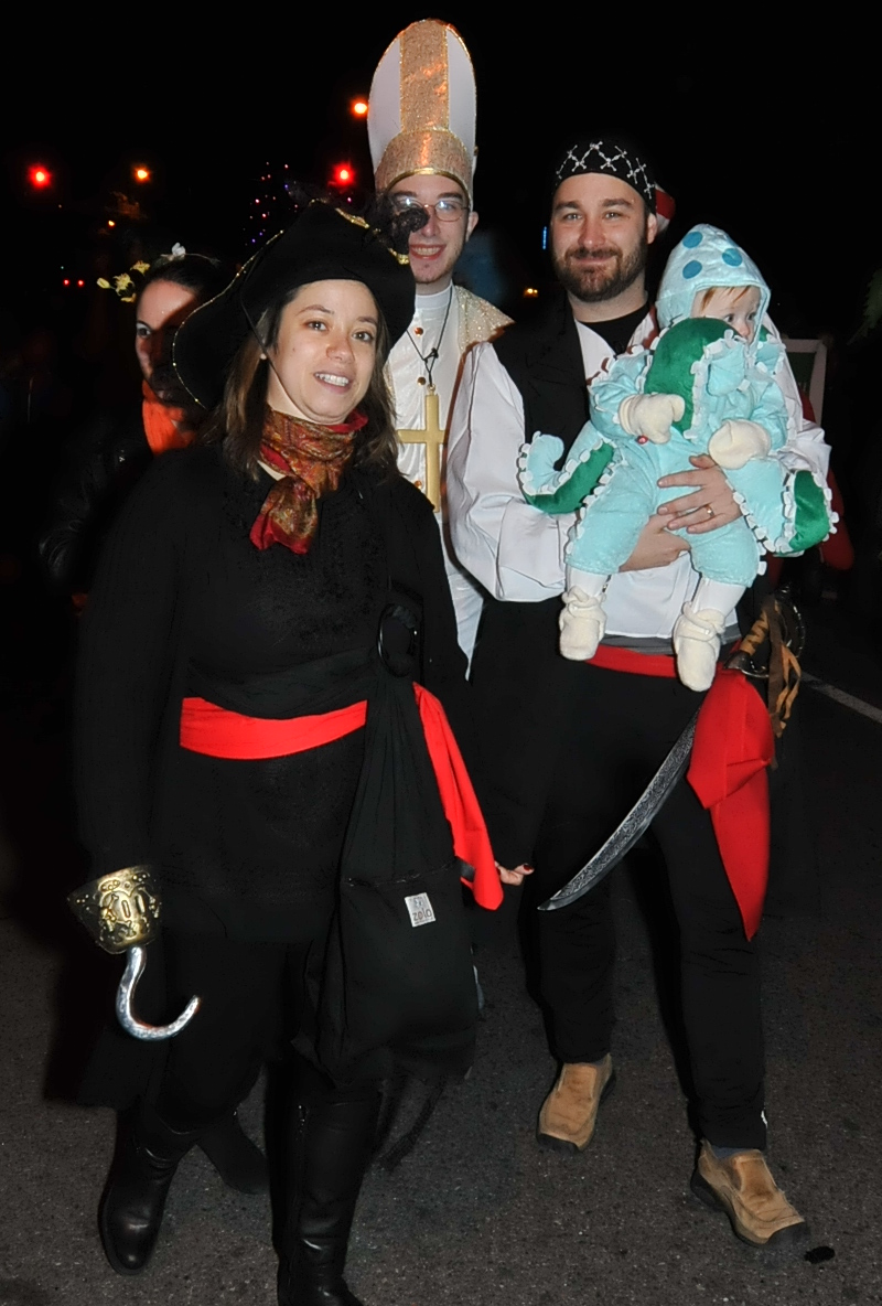 7:12 PM. A pirate couple carrying an octopus. Behind is a bishop or pope.