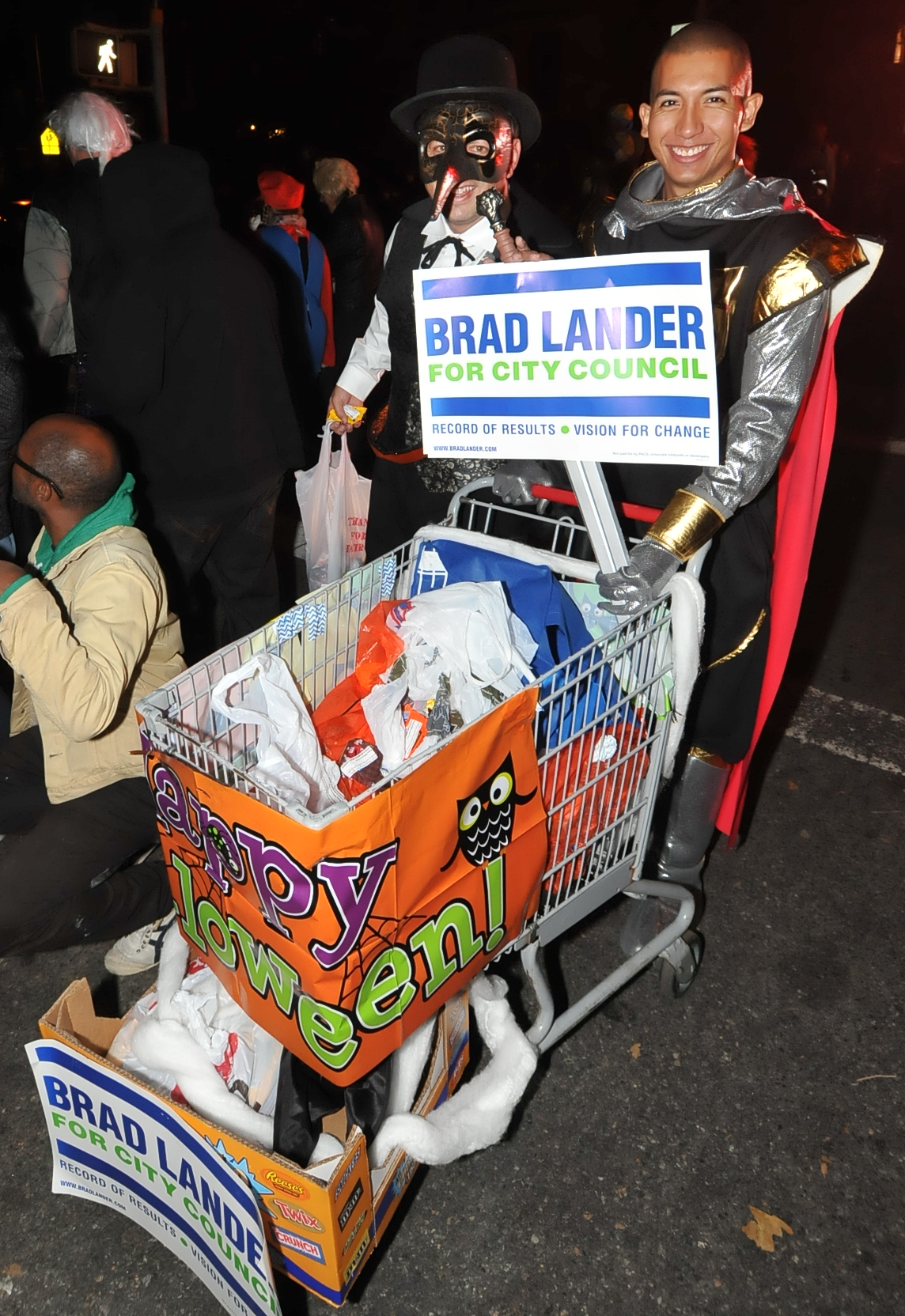 7:51 PM. Brad Lander for City Council. Brad is the Plague Doctor in back. His aide is in a ? costume.
