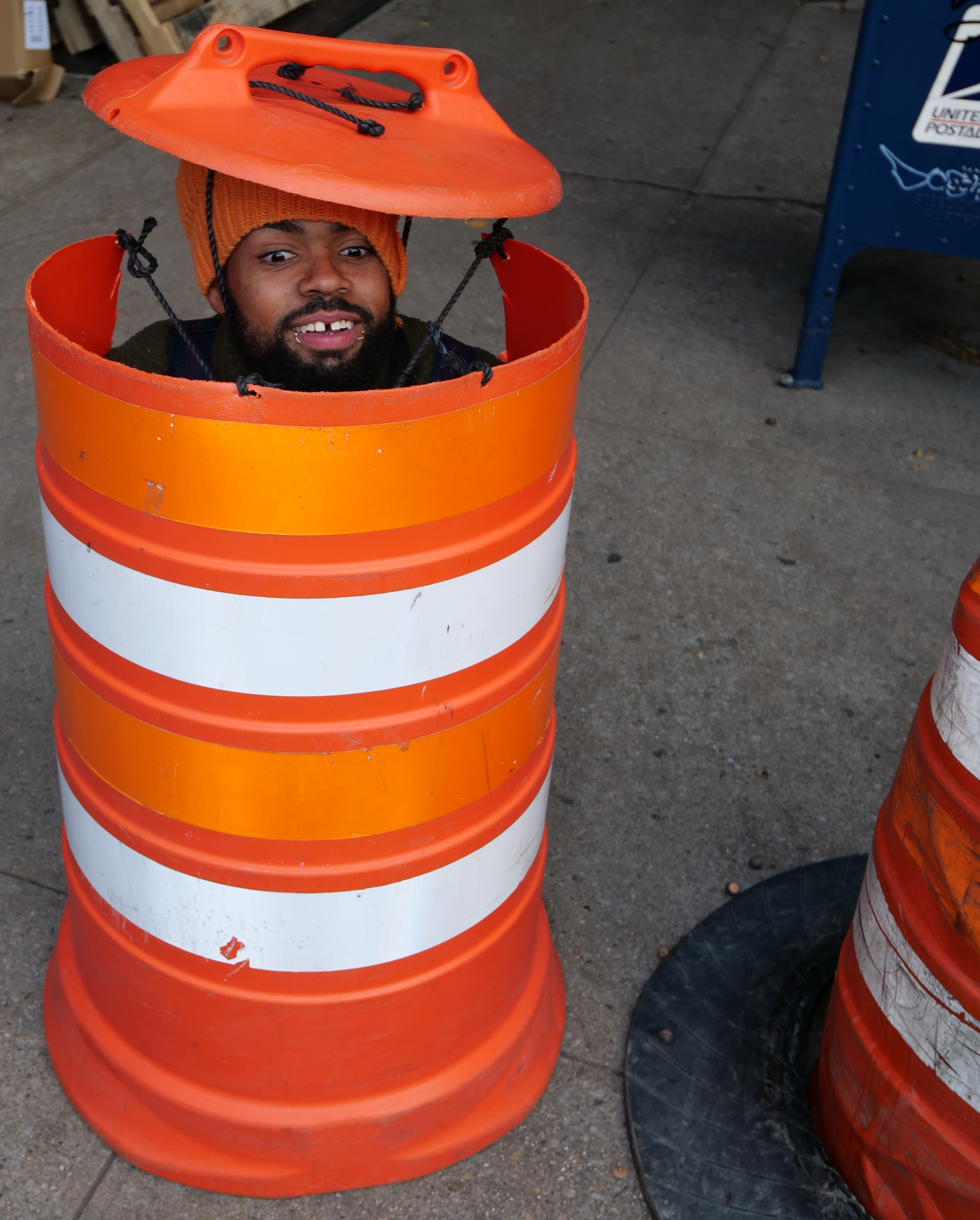 5:06 PM. Hiding in a traffic barrel. Could be Oscar the Grouch from