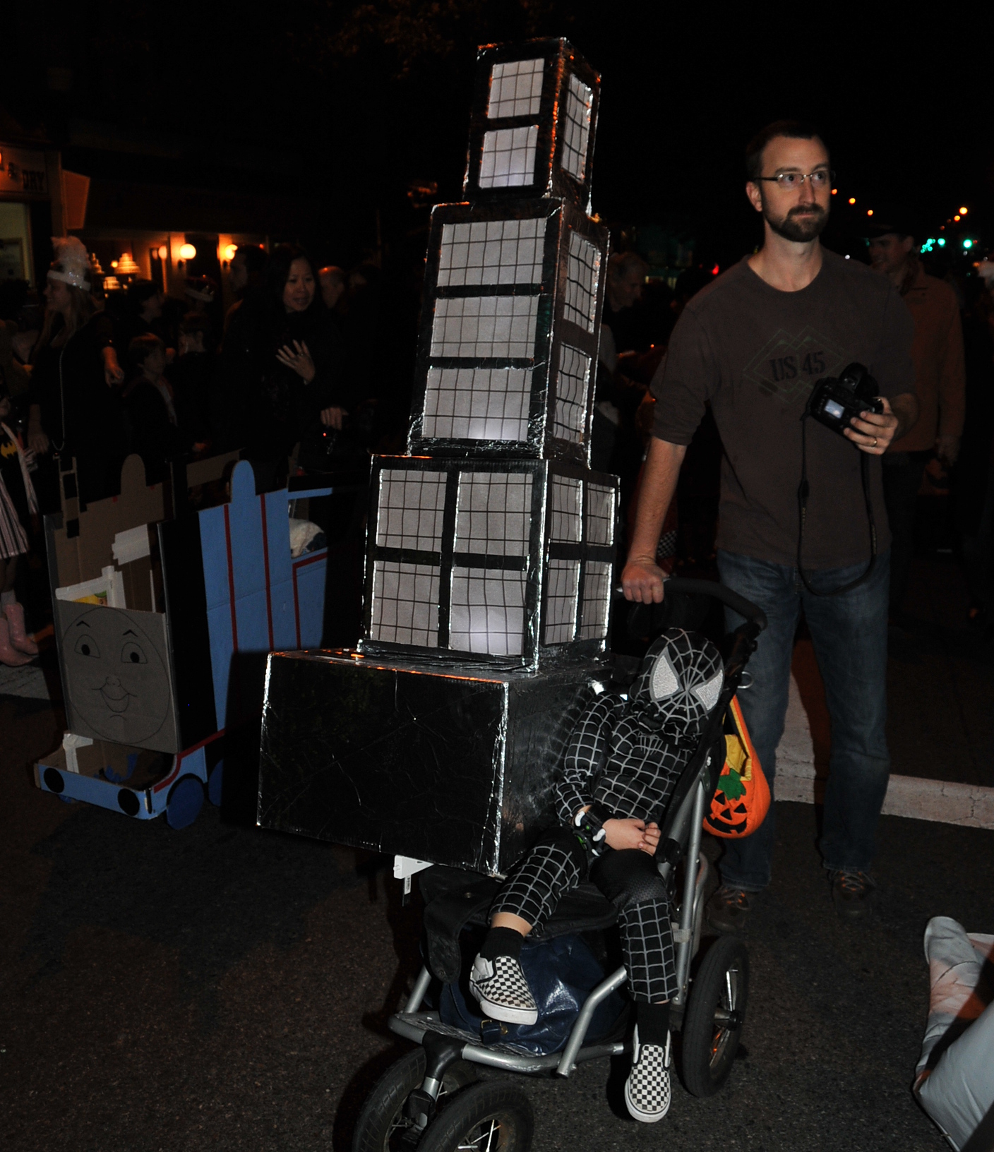 7:24 PM. An office tower construction with a little Spiderman trying to climb the building.