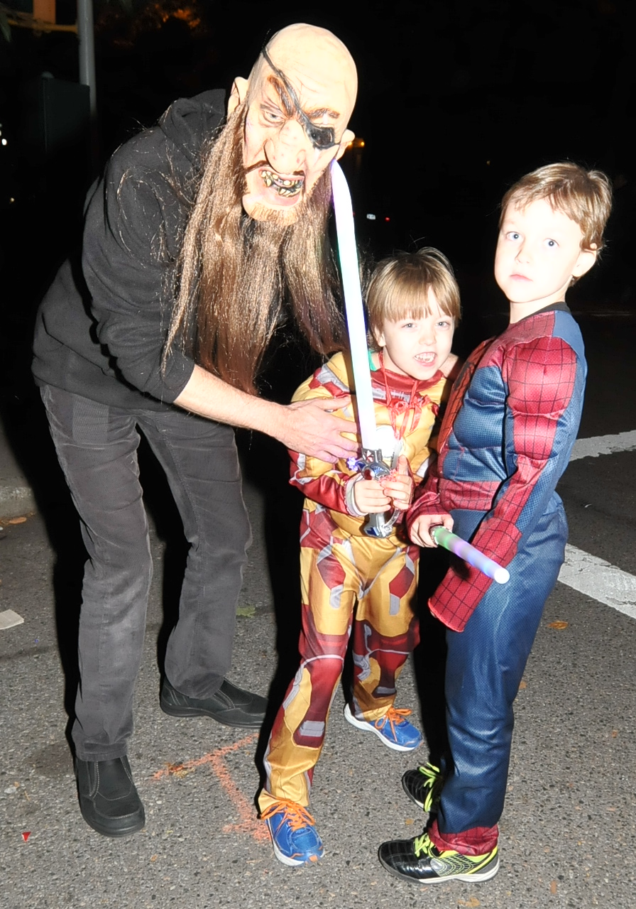 7:28 PM. A pirate, Iron Man, and Spiderman.