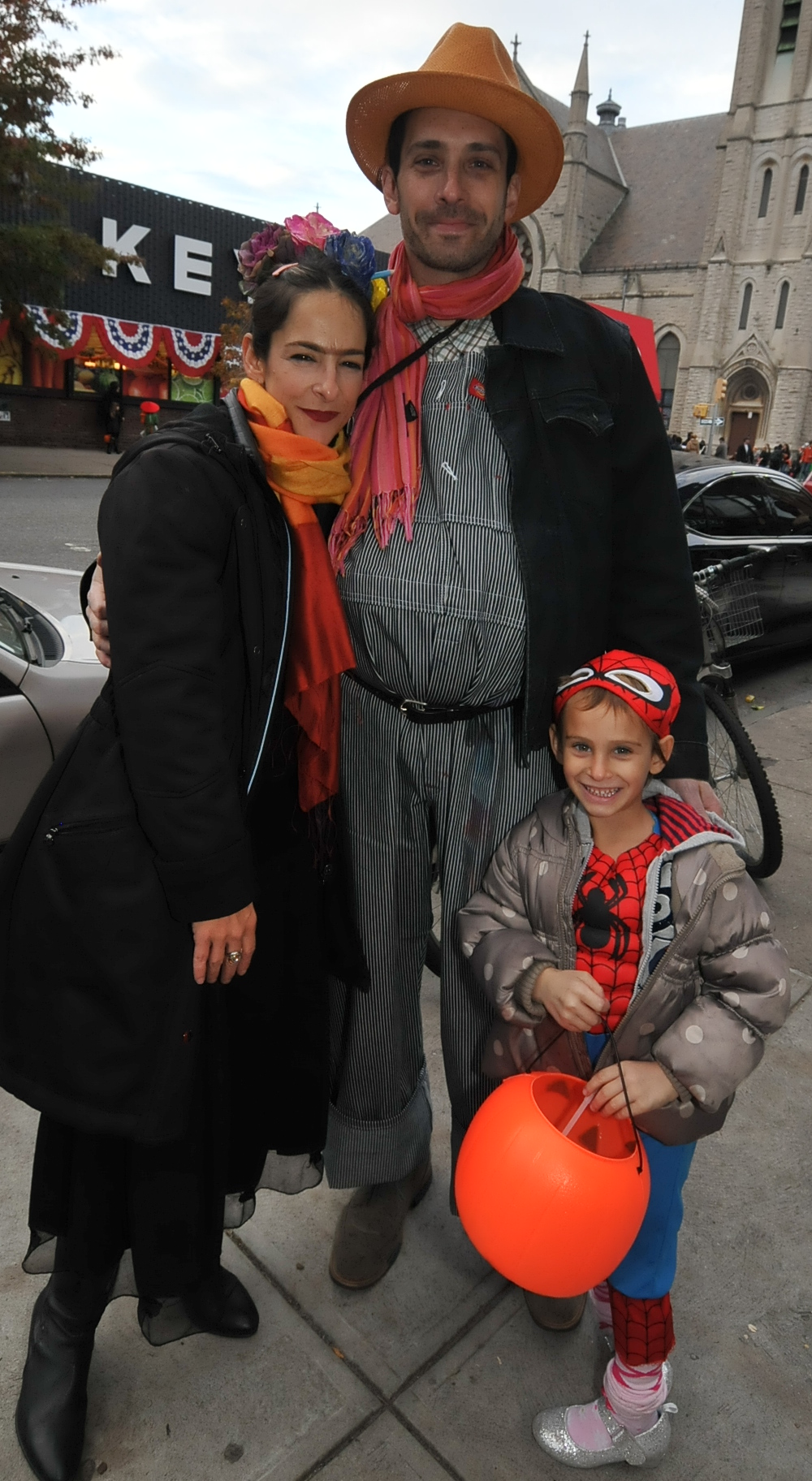 5:17 PM. Dressed as artist Frida Kahlo, a farmer, and a little Spiderman.