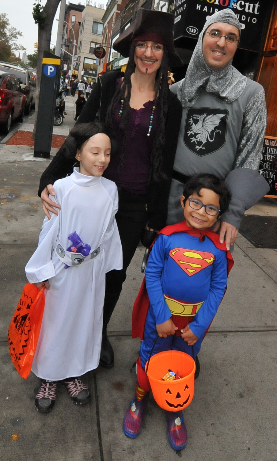 4:45 PM. Parents are a pirate and a knight. Kids: Princess Leia from