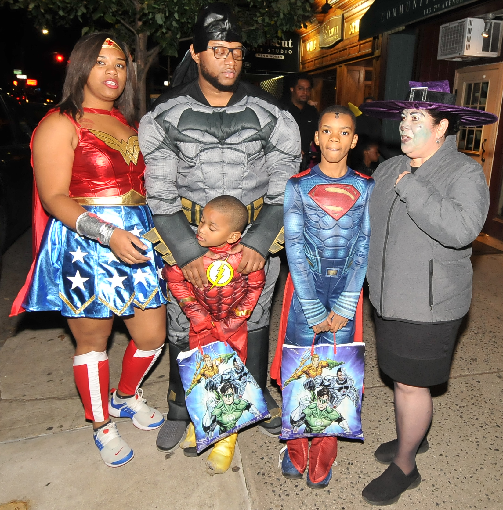 6:51 PM. Wonder Woman, Batman, a little Flash Gordon, Superman and a witch.