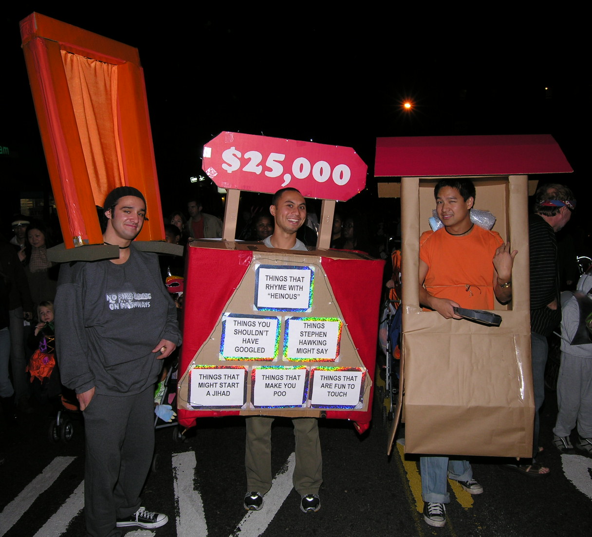 7:07 PM. Constructions: A Gate from Christo and Jeanne-Claude's installation in Central Park with a No bikes on pathways shirt, Family Feud Game Show, and a contestant.