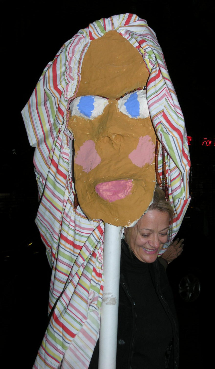 7:12 PM. Puppet or mask on a pole construction. Arab sheik?