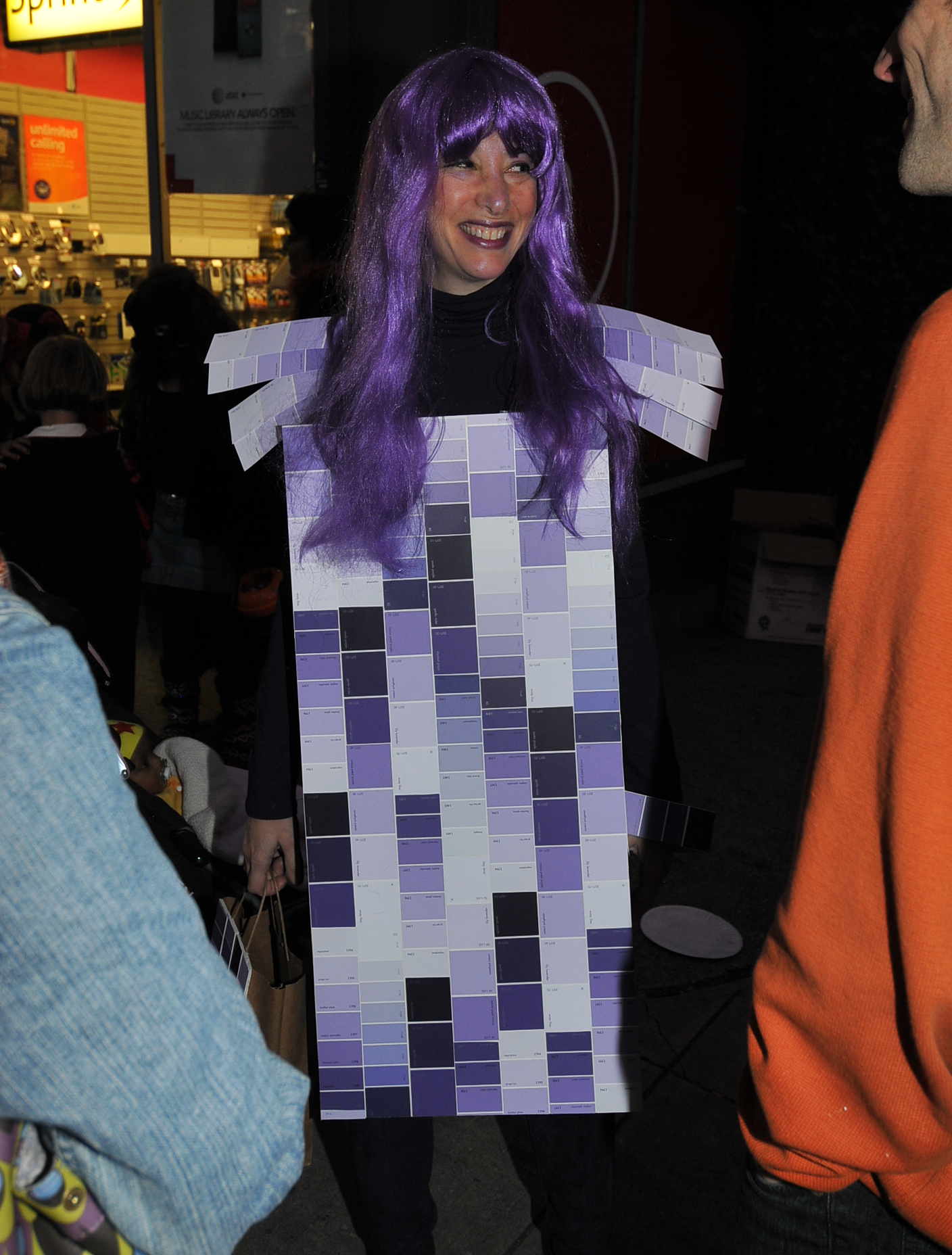 6:03 PM. A color chart, a construction with numerous paint color chips in shades of purple.