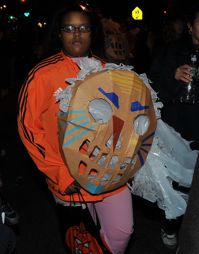 7:15 PM. A large mask construction of a cat, a takeoff on Michael Myers's mask.