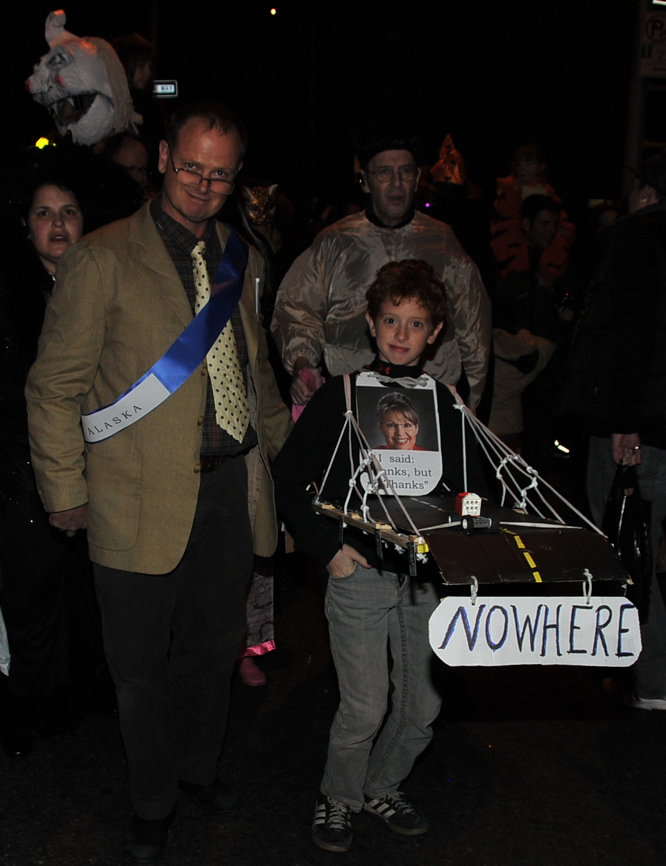 7:19 PM. The theme is the proposed Alaska Road to Nowhere, more formerly known as Gravina Island Bridge. The bridge was not built, but the road was. It goes nowhere. Note kid with bridge construction.