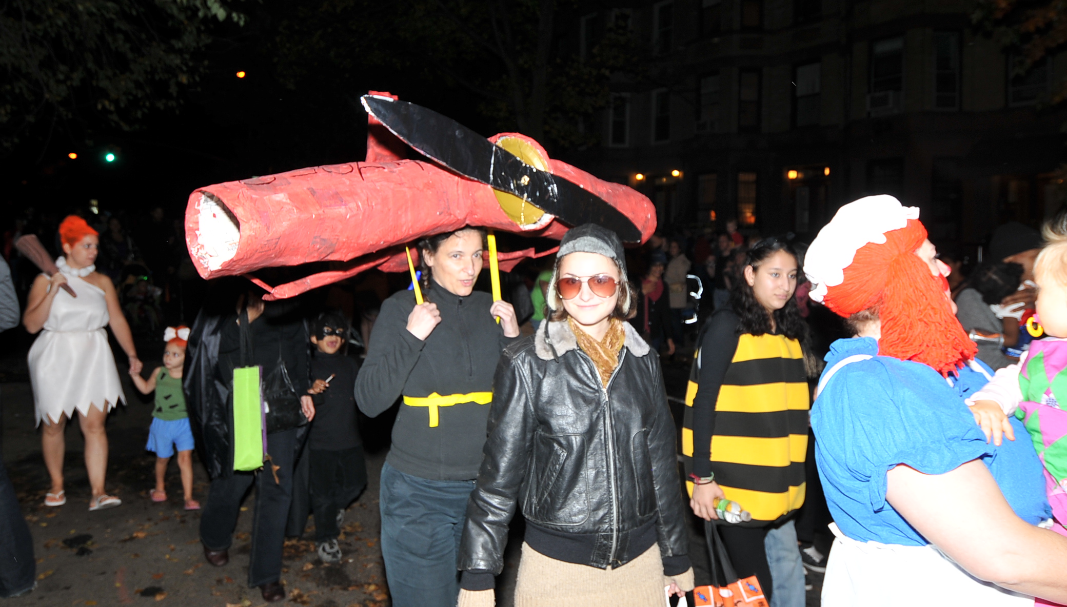 7:33 PM. A construction of an airplane with a female aviator. At left, the Flintstones: Wilma and Pebbles. At right, a bee and Raggedy Ann.