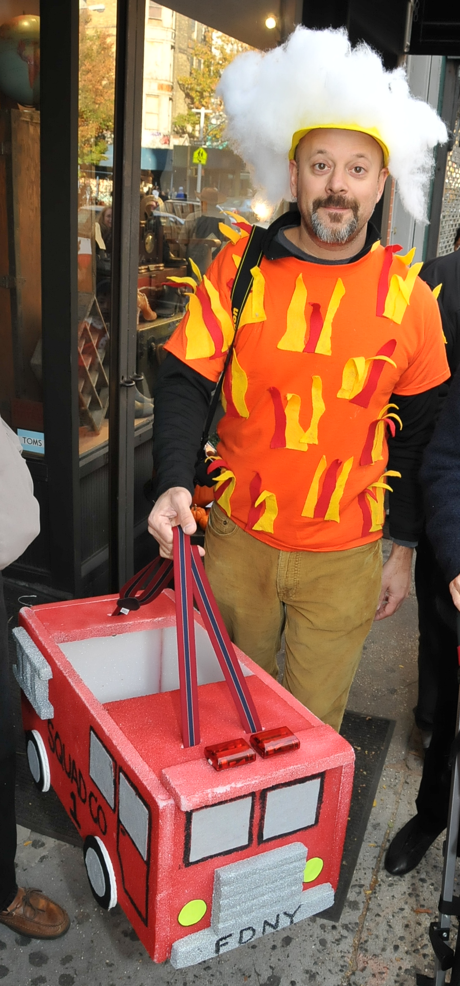 4:37 PM. A fire truck construction being held by a man in a fire costume.