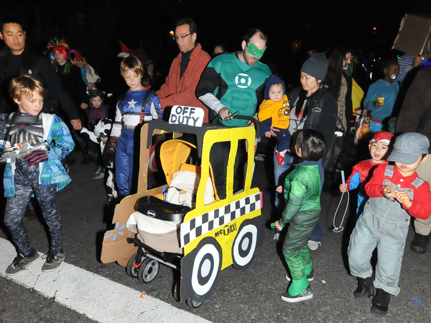 7:20 PM. A taxi cab construction. Behind is Captain America and a Green Lantern costume. At right is the little Green Lantern. Further right is a jester and a train man. At left ?