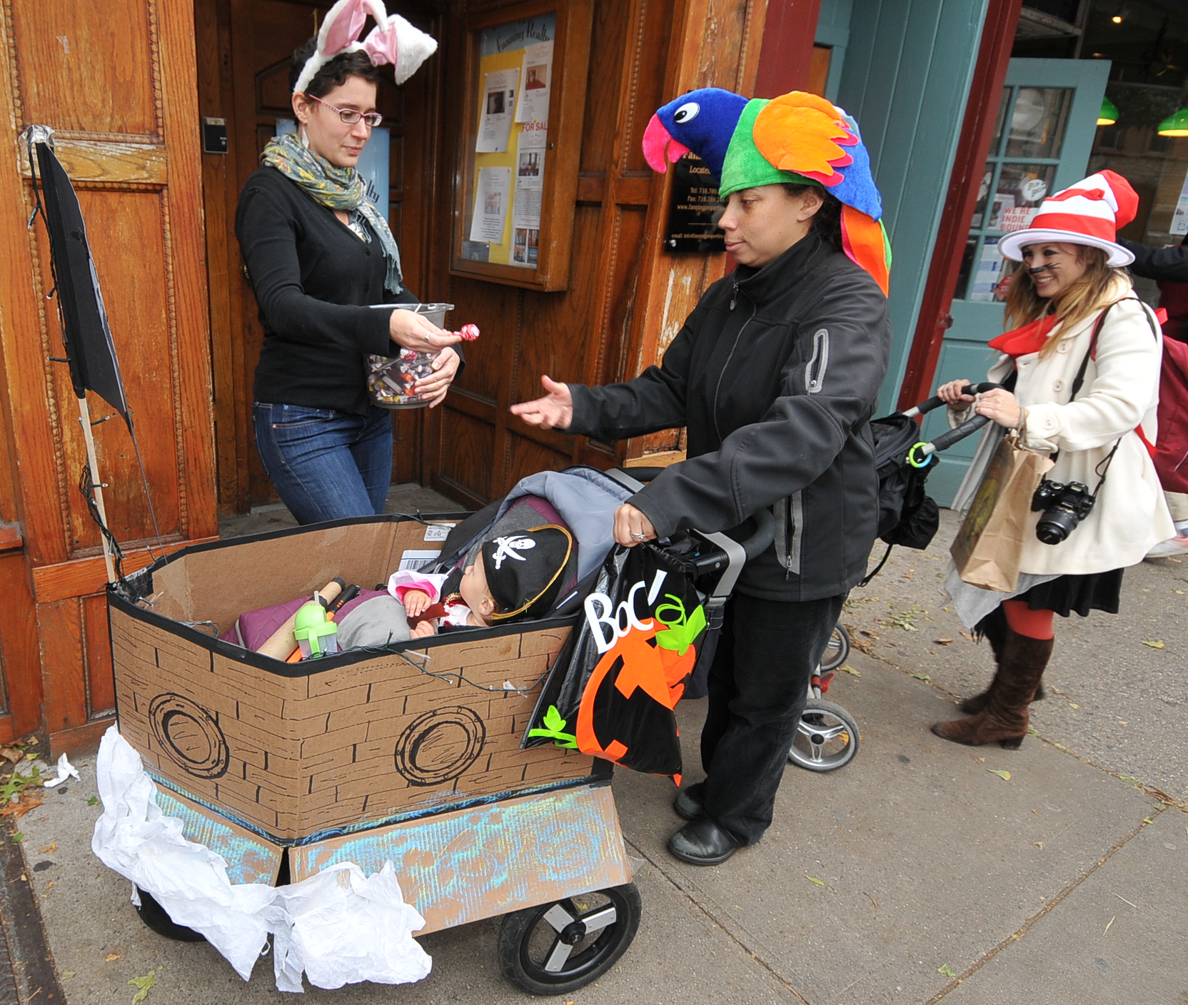 3:41 PM. A pirate ship construction, with a little pirate, being pushed by a parrot. A Dr. Seuss's Cat in the Hat to the right. In front of
