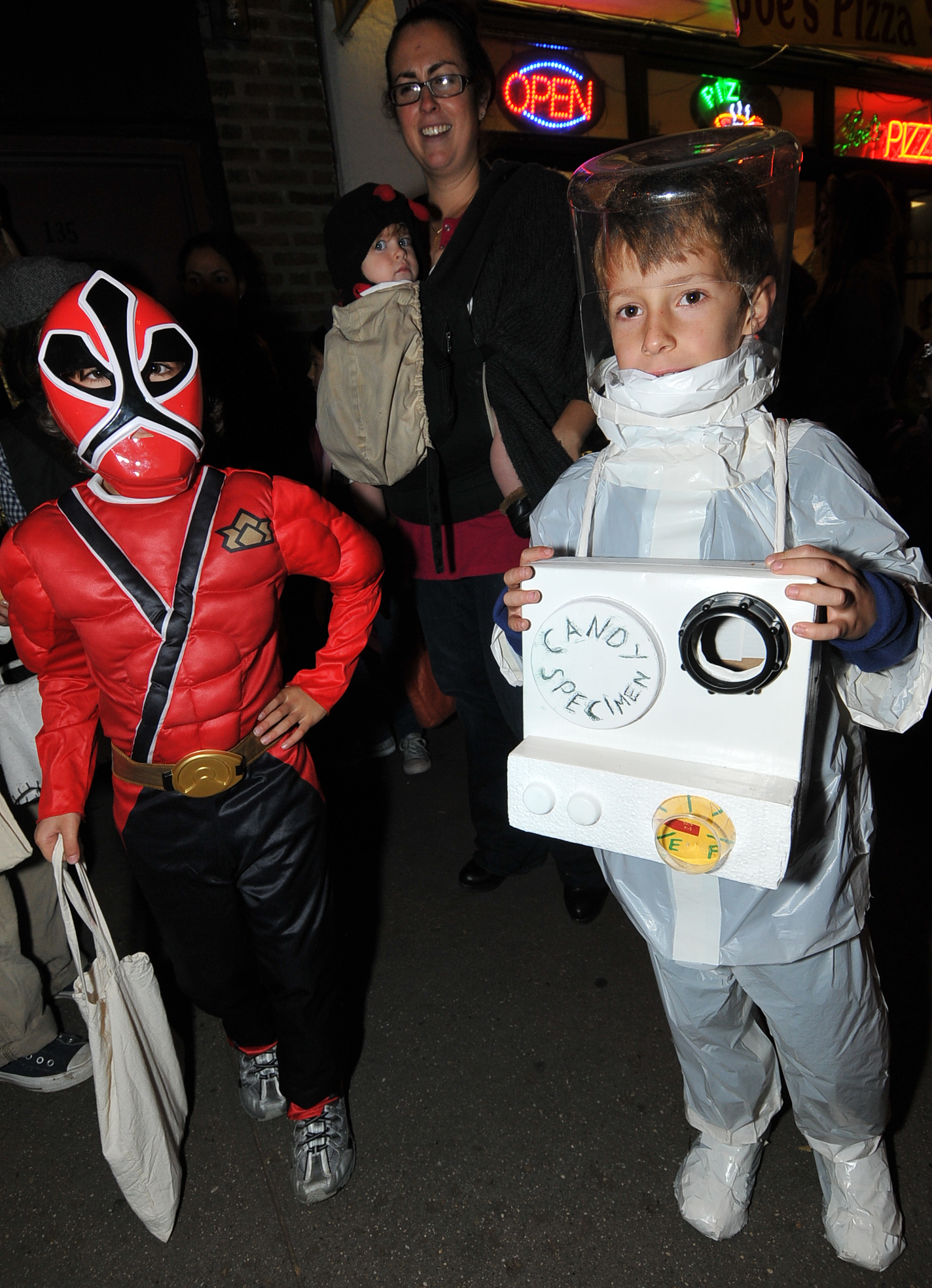 6:19 PM. On left, Red Ranger from the television show "Power Rangers." The other is an astronaut with a construction of a candy specimen collecting machine.