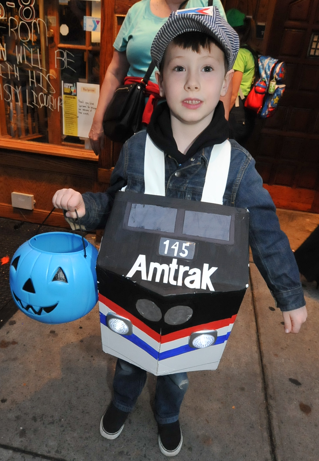 5:35 PM. An Amtrak train engine construction with a little engineer.