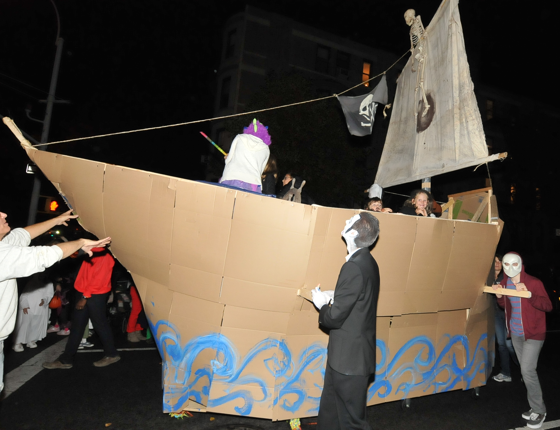7:16 PM. A large pirate ship construction holding a lot a kids. This is a regular at the parade.