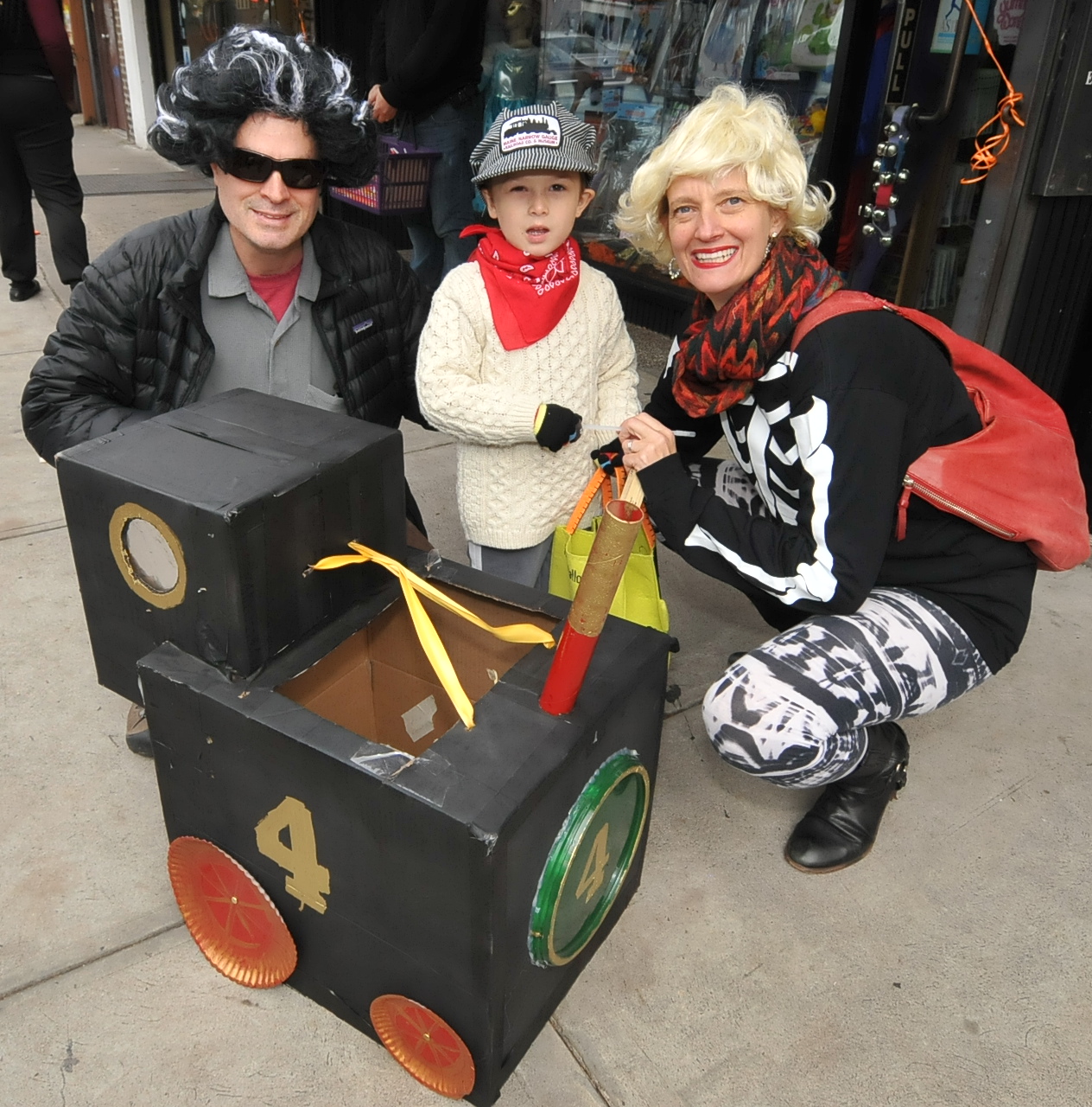 3:55 PM. A train engine construction with a little engineer. Dad is ?. Mom is a skeleton.
