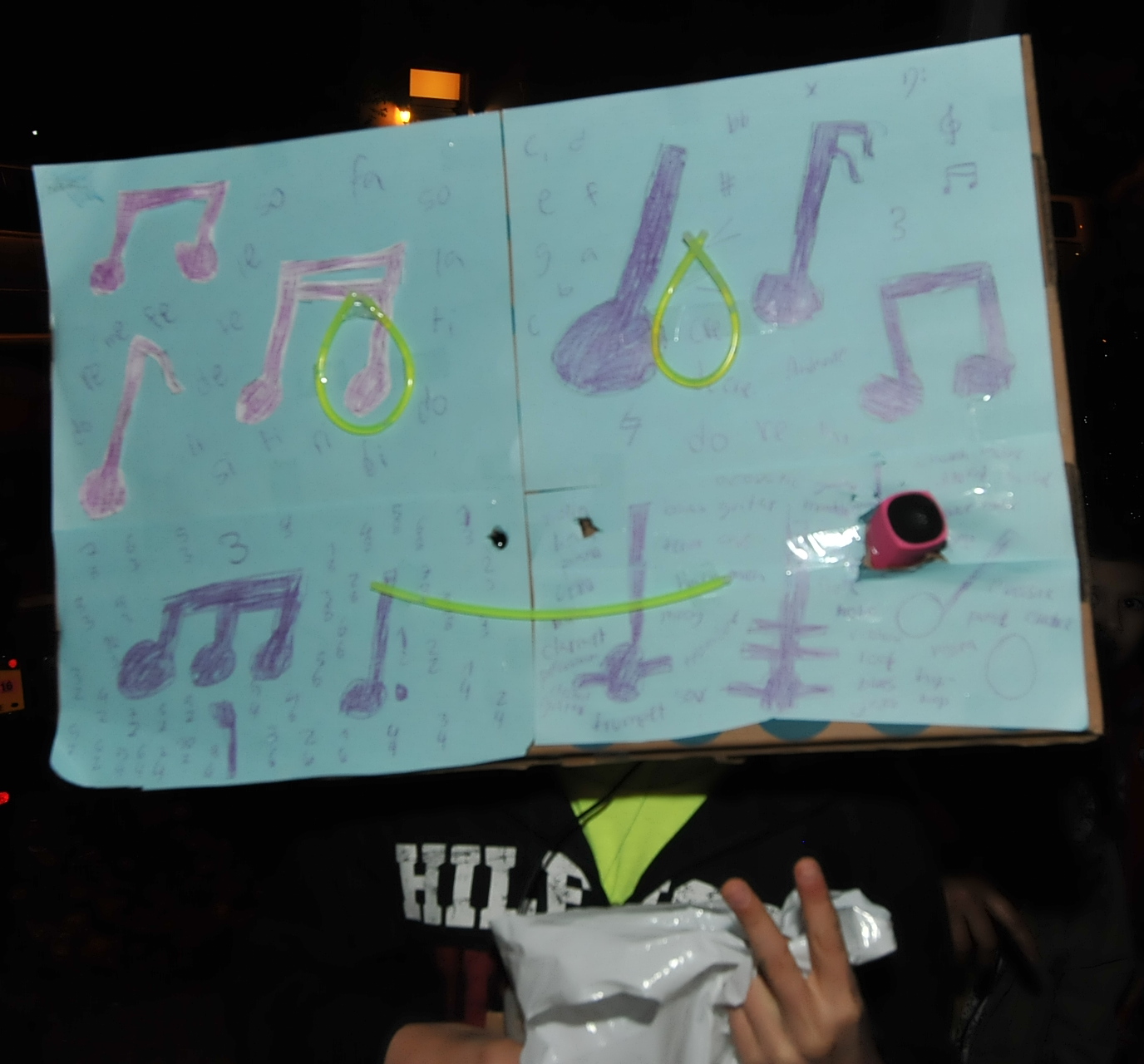 7:15 PM. A construction of a face with musical notes. Meaning?