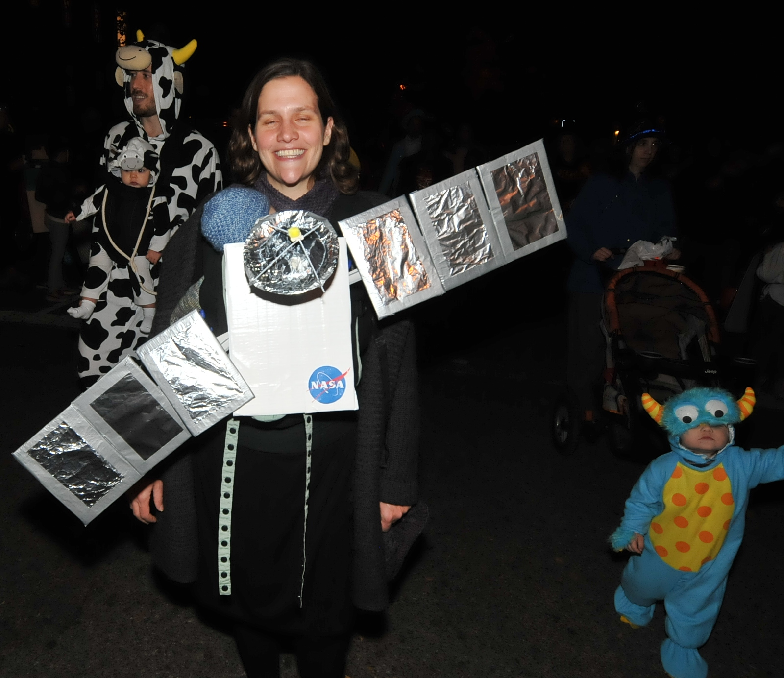 7:40 PM. A satellite construction. At right, a Mini Monster costume in blue. Also in pink for girls. Behind is a spotted cow.