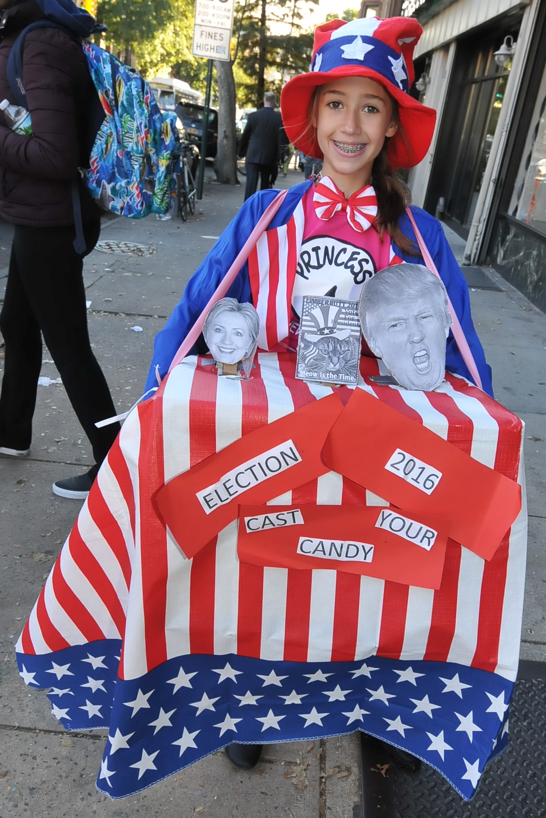 4:17 PM. A voting booth construction. Her shirt is Princess 1, a take on Thing One from Dr. Seuss. You cast your vote by chosing which hole to drop the candy in.