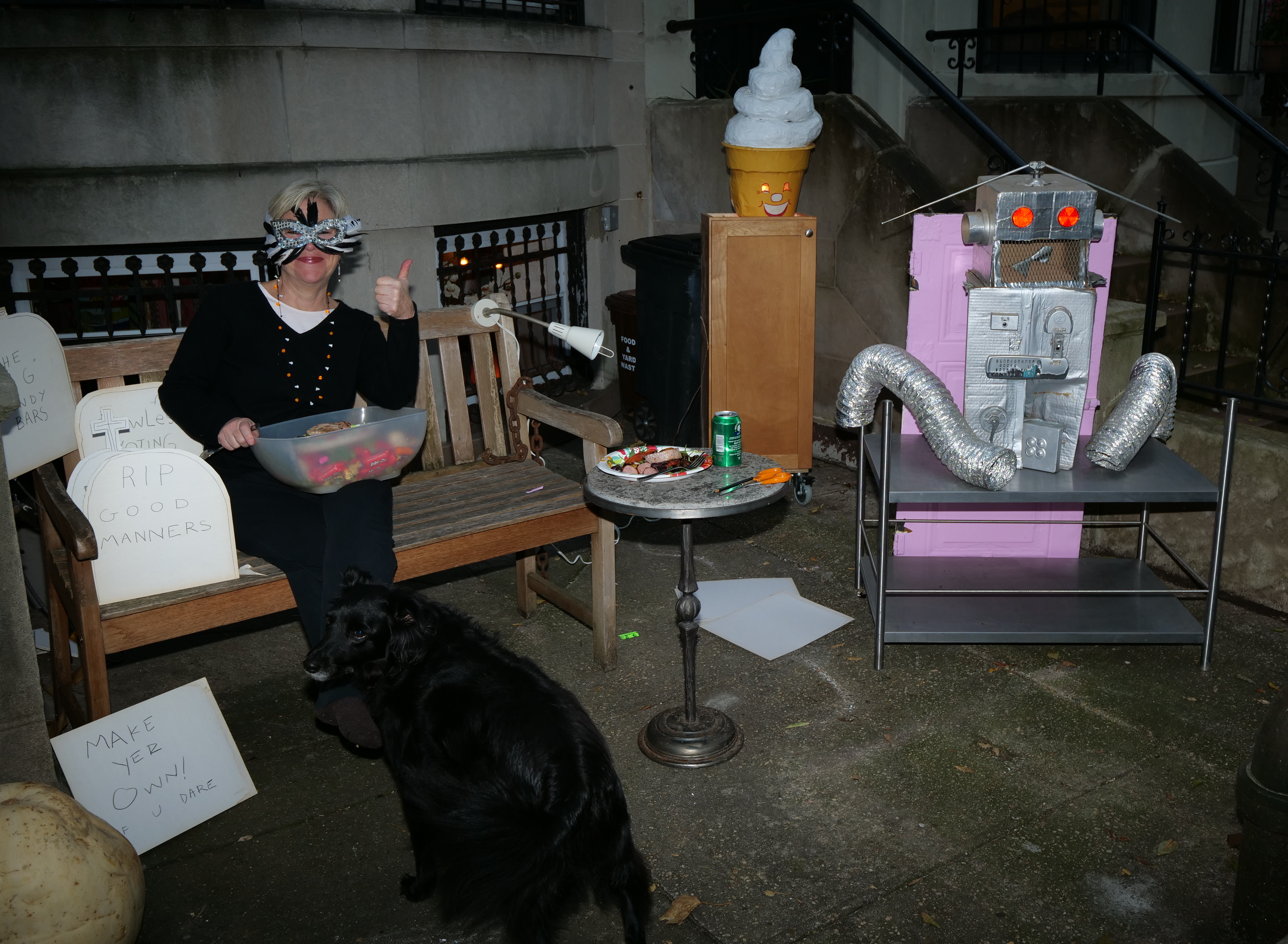 5:43 PM. Another neighbor. At times the husband crouched behind the robot construction and put his arms through the flexible ducts. You could not see him. Then when children approached he would start waving the duct arms.