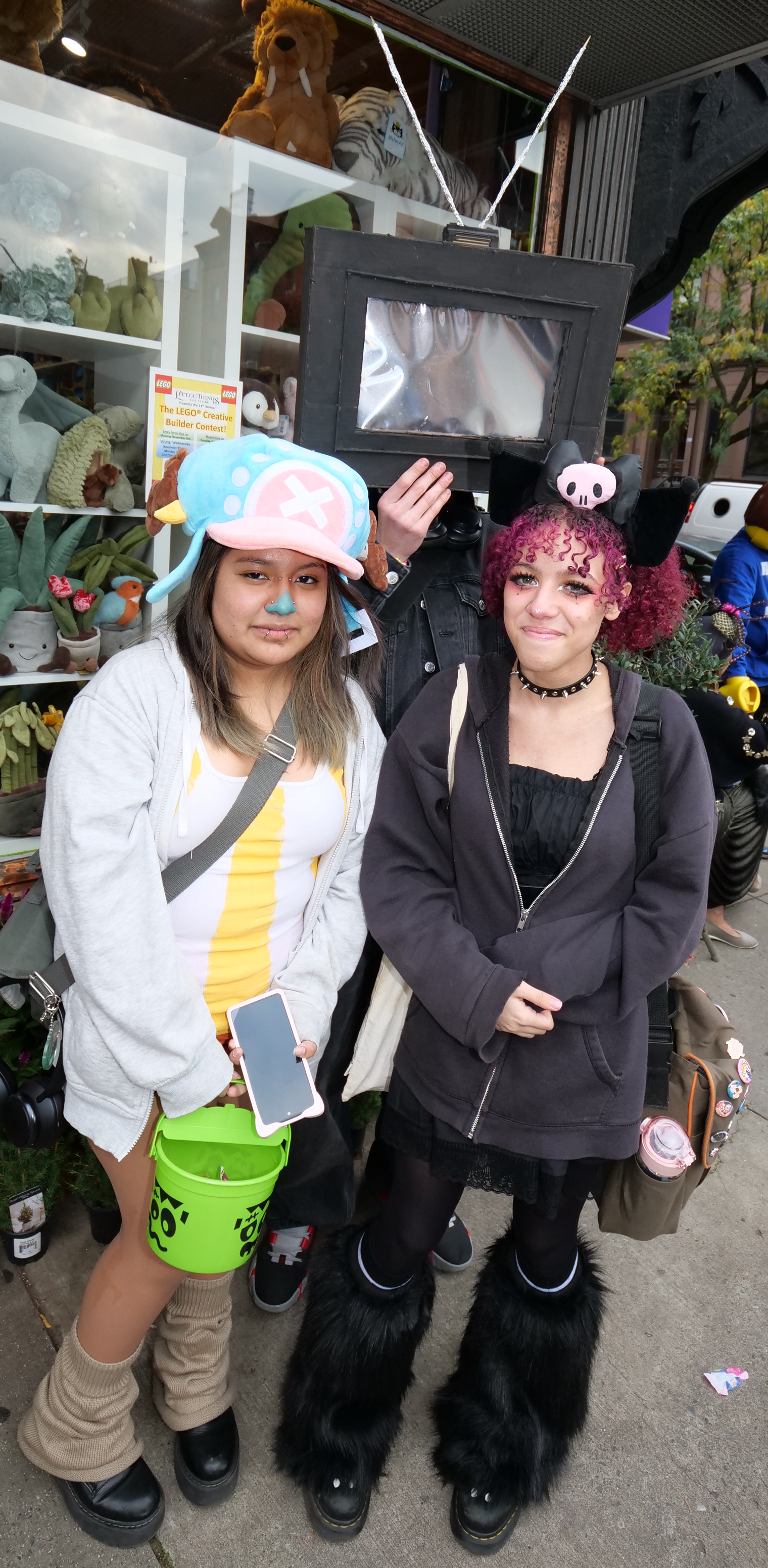 4:53 PM. On the left is a DejavYOU One Piece Hat from Walmart. A television construction in the background. On the right, a cat wearing a Sanrio Puroland Kuromi headband.