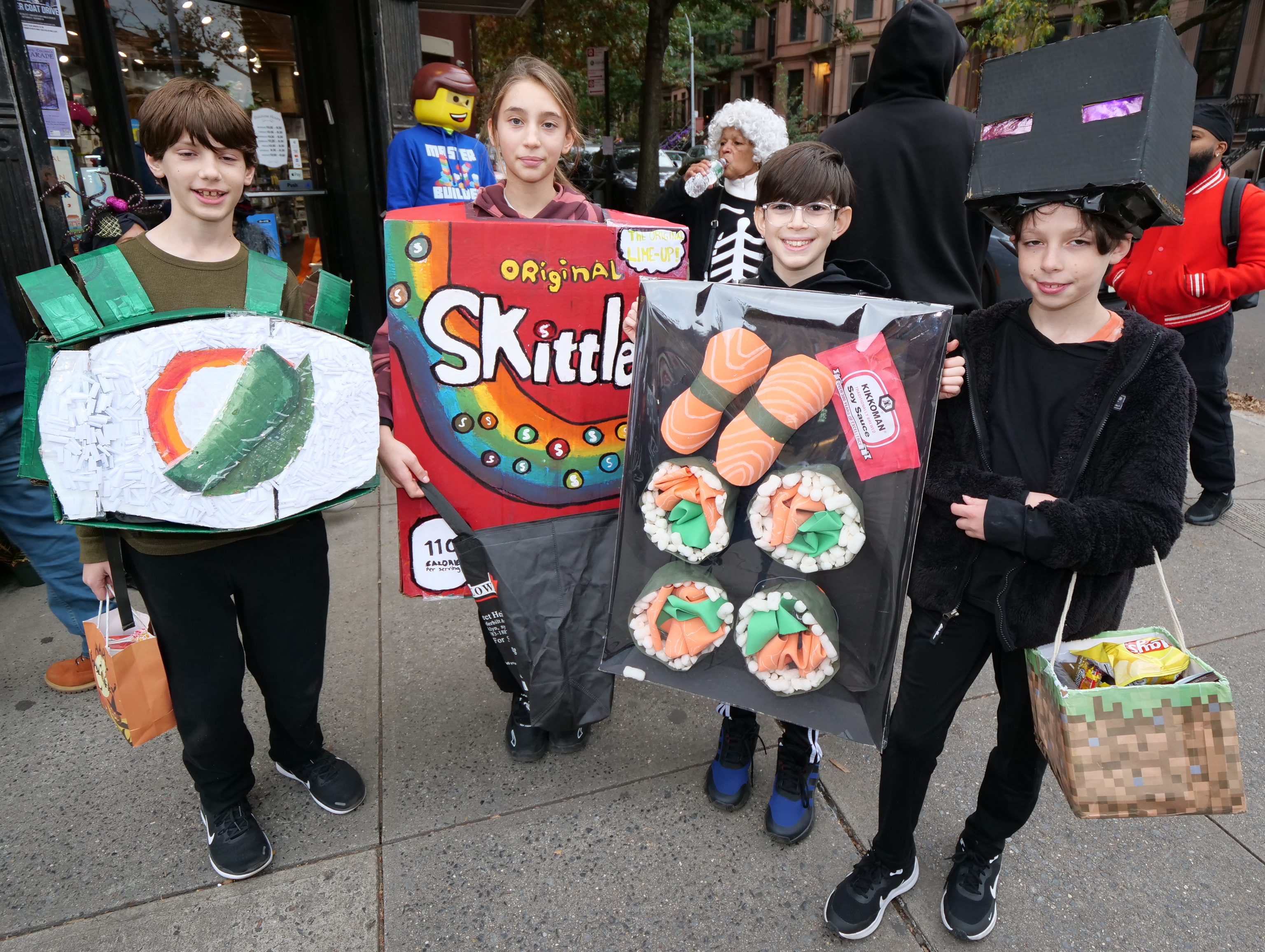 5:06 PM. All constructions: a piece of sushi, an Original Skittles, a sushi take-out tray, and Enderman from Minecraft (carrying a grassy block storage bin).