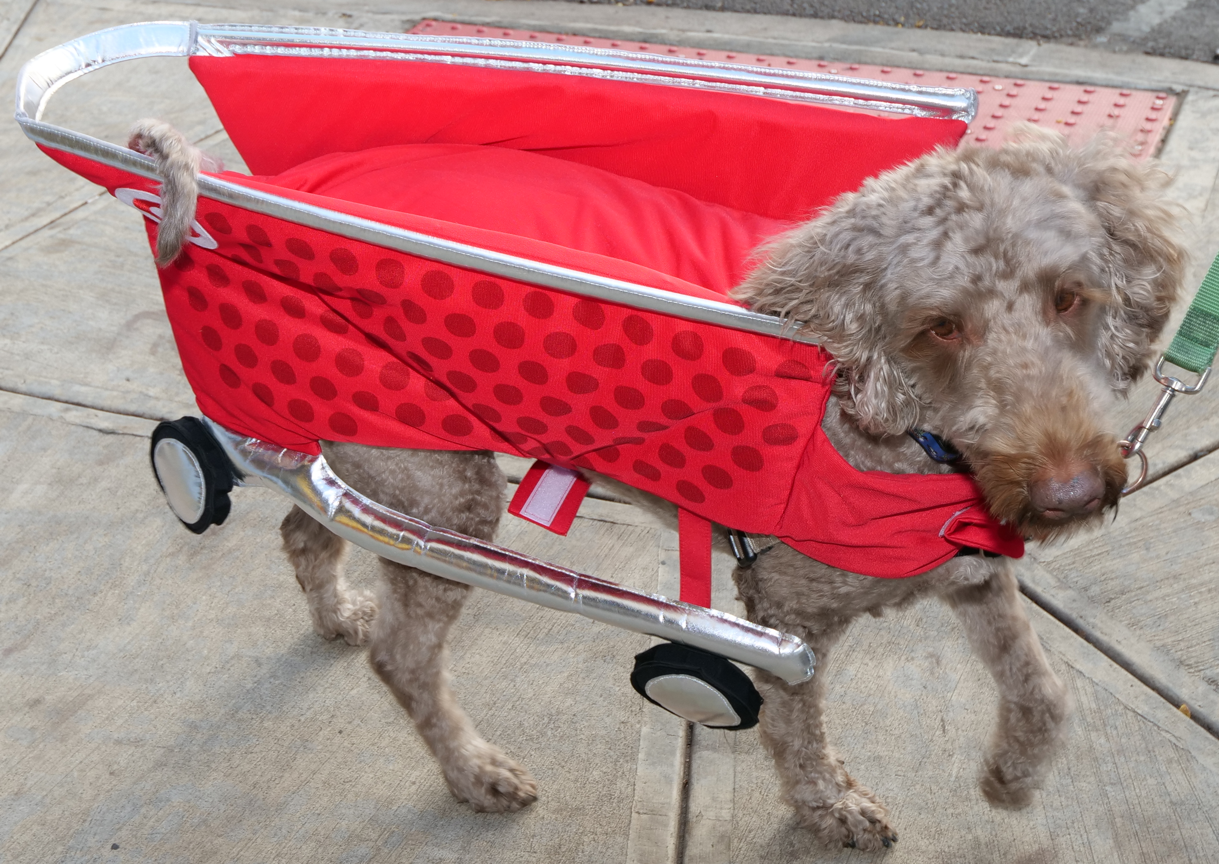 4:29 PM. A dog wearing a shopping cart construction.