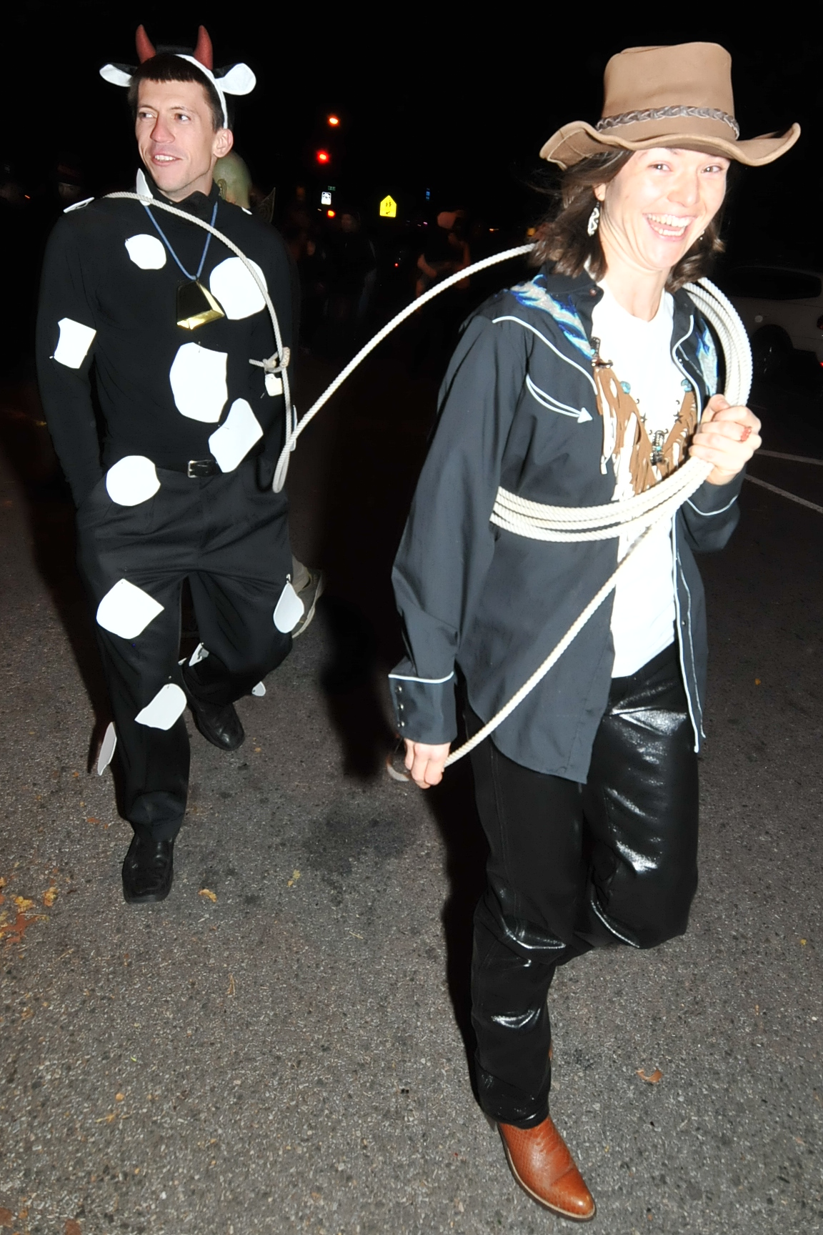 7:11 PM. A cowgirl that has roped a spotted bull.