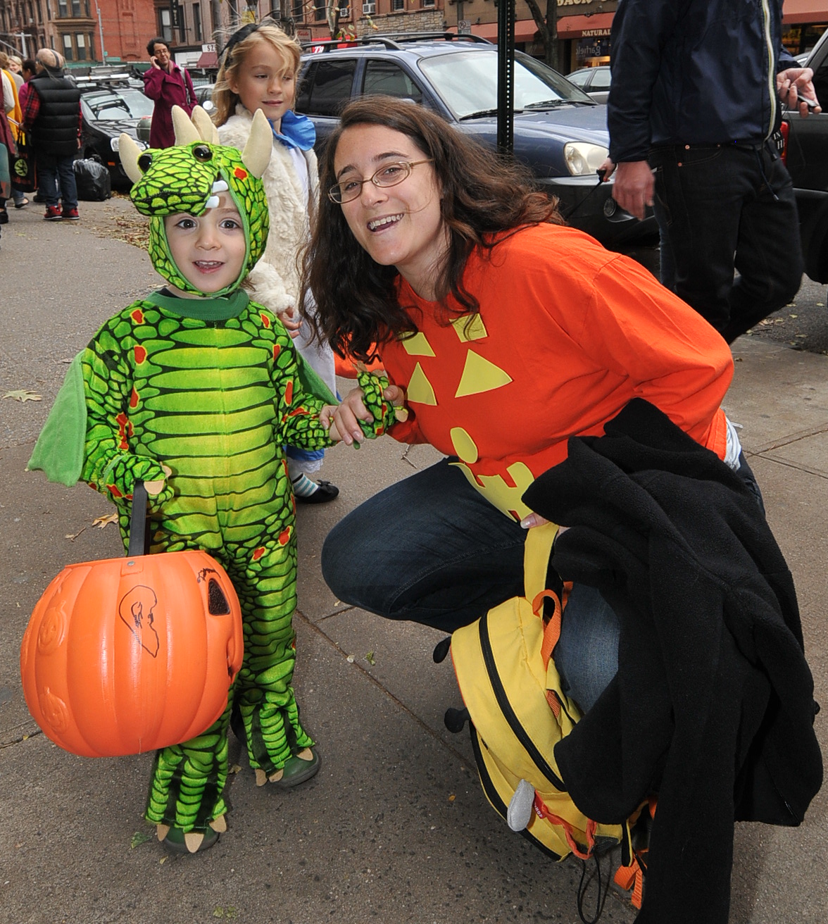 4:13 PM. A green dragon. Mom is wearing a T-shirt with a jack-o'-lantern design.