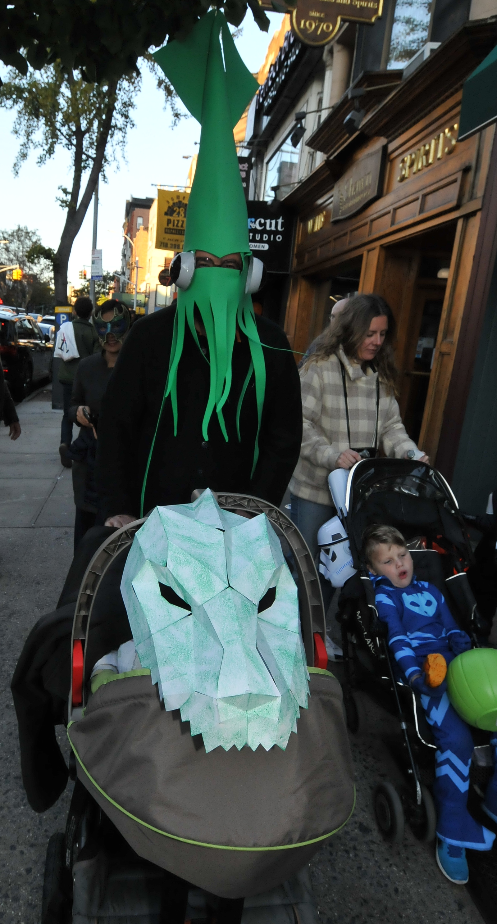 5:11 PM. The father is a squid, in the carriage is a papercraft monster or dragon, and in the stroller a Catboy from