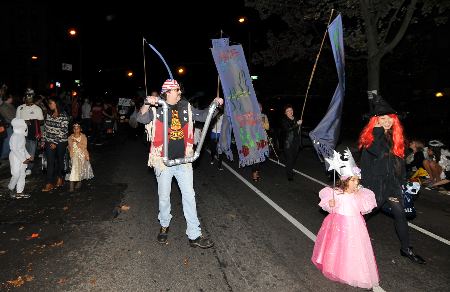 7:18 PM. A motorcycle chopper rider, Japanese banners, a little fairy, and a witch.