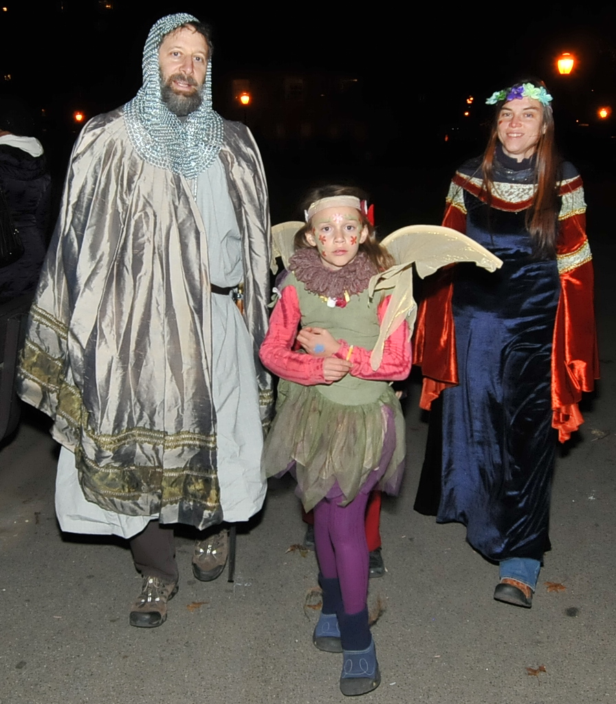 7:36 PM. Medieval family: a knight with a chain mail headdress, a little fairy, and mom in a style often associated with medieval aesthetics.
