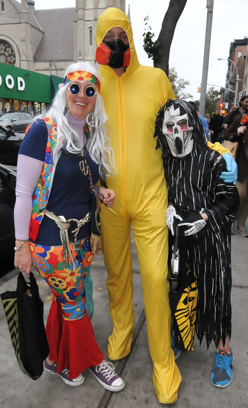 4:58 PM. A hippie, a man in a yellow hazmat suit and respirator, and a screaming ghost mask.