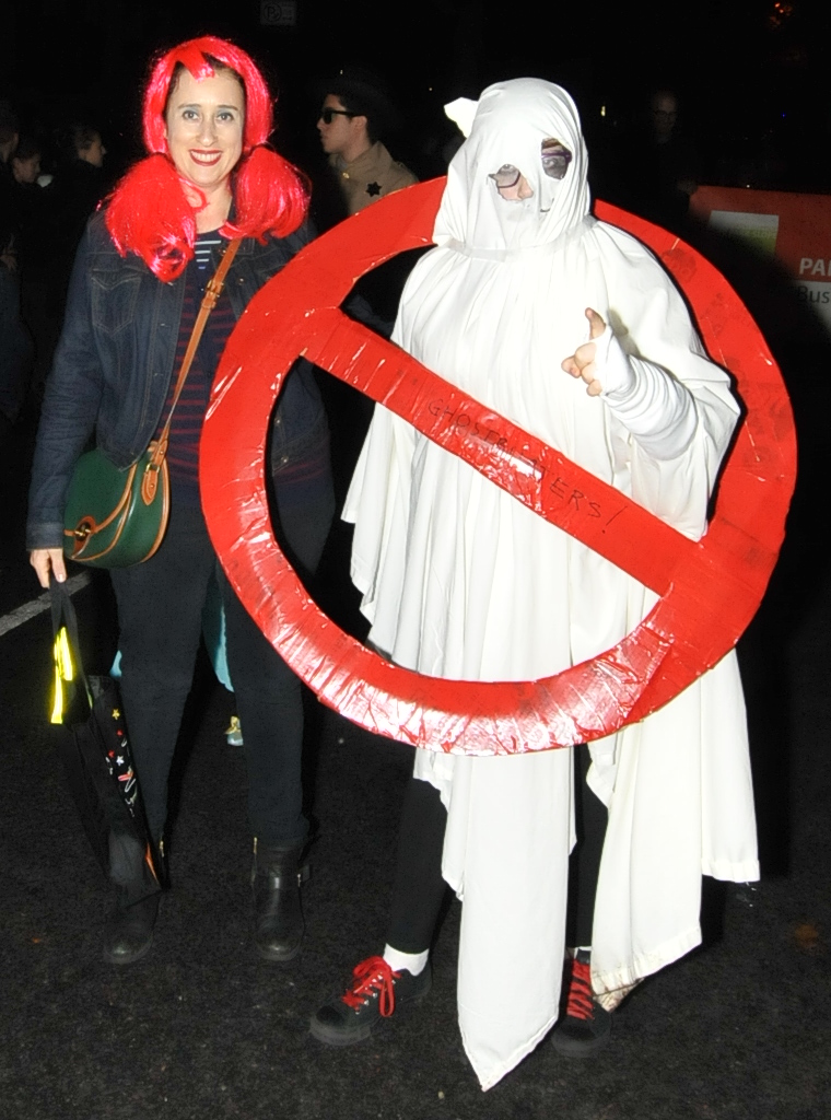 7:25 PM. A traditional ghost costume, with a large Ghostbusters logo. She is Janine Melnitz, the secretary of the Ghostbusters.