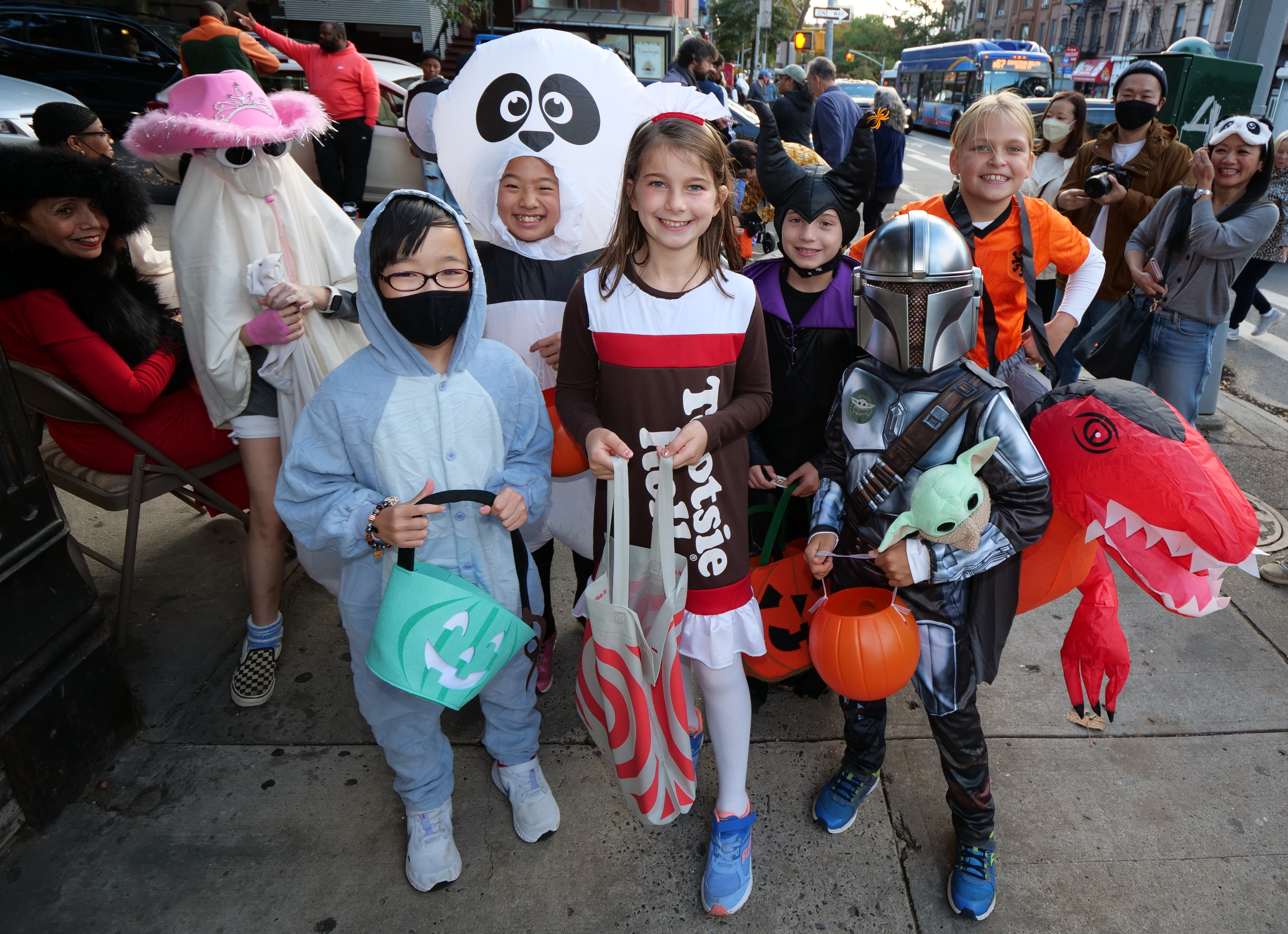 4:33 PM. Shelley from Little Things Toy Store, a ghost, a blue ?, a, inflatable panda, a Tootsie Roll, Maleficent, the Mandalorian from the Disney+ series of the same name, and a boy riding an inflatable dinosaur.