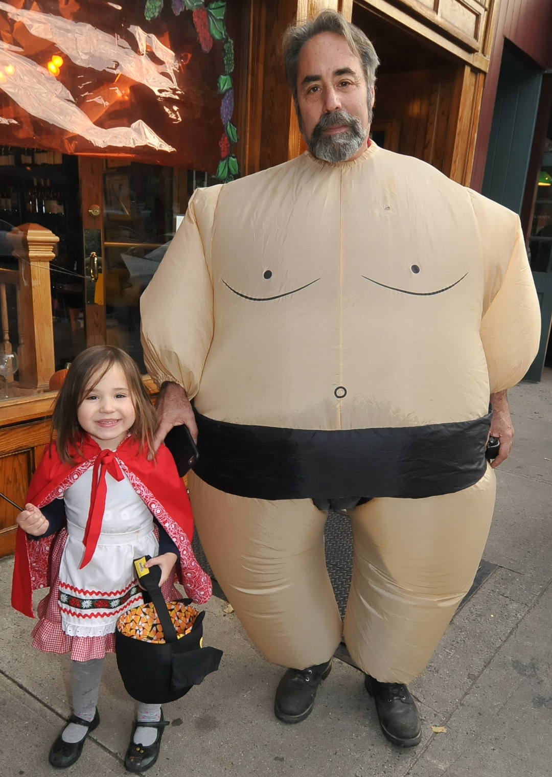 4:57 PM. An inflatable sumo wrestler, and Little Red Riding Hood.