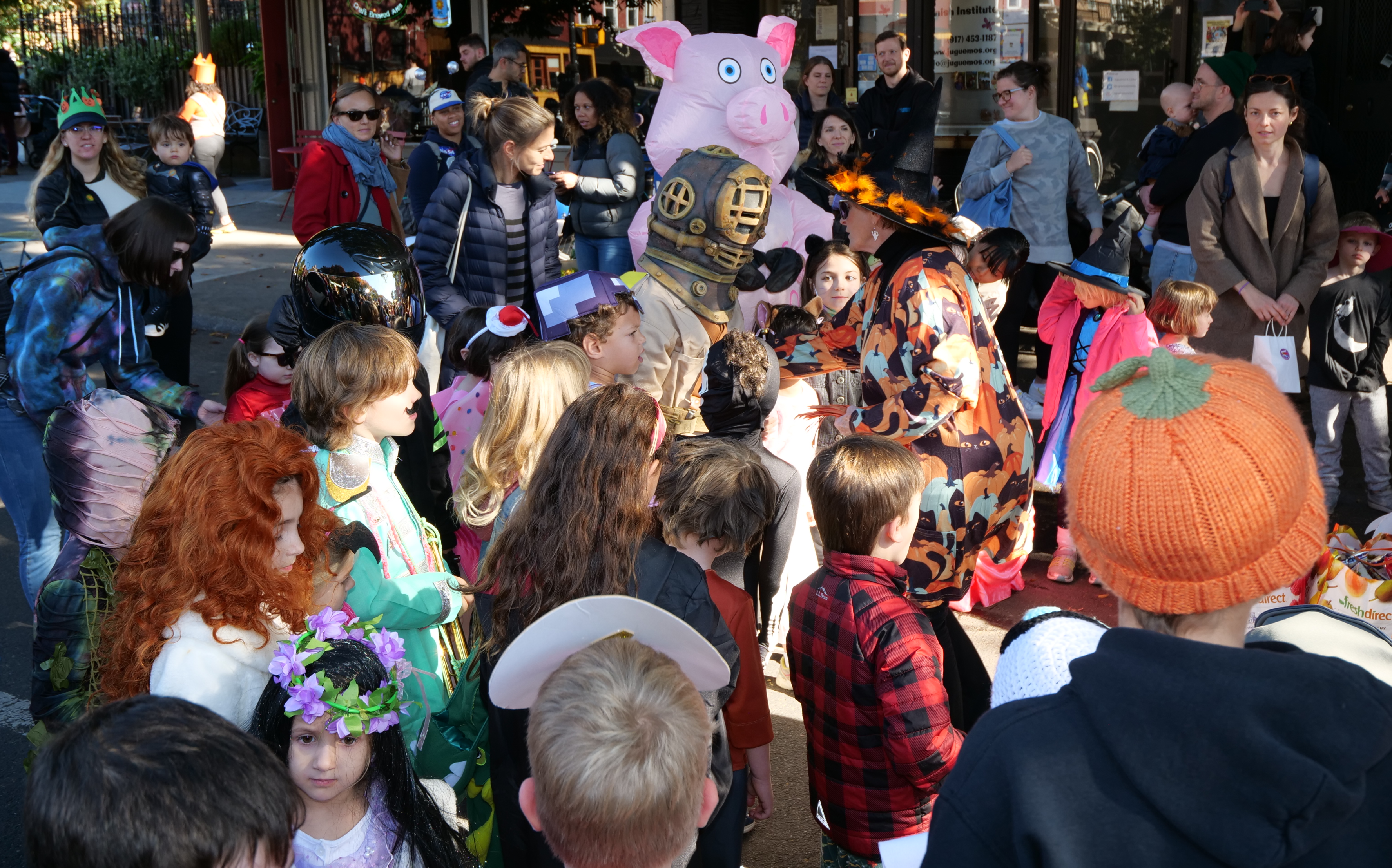 10/29, 2:17 PM. A large group. A deepsea diver, an inflatable pink pig costume, and autumn witch in back.