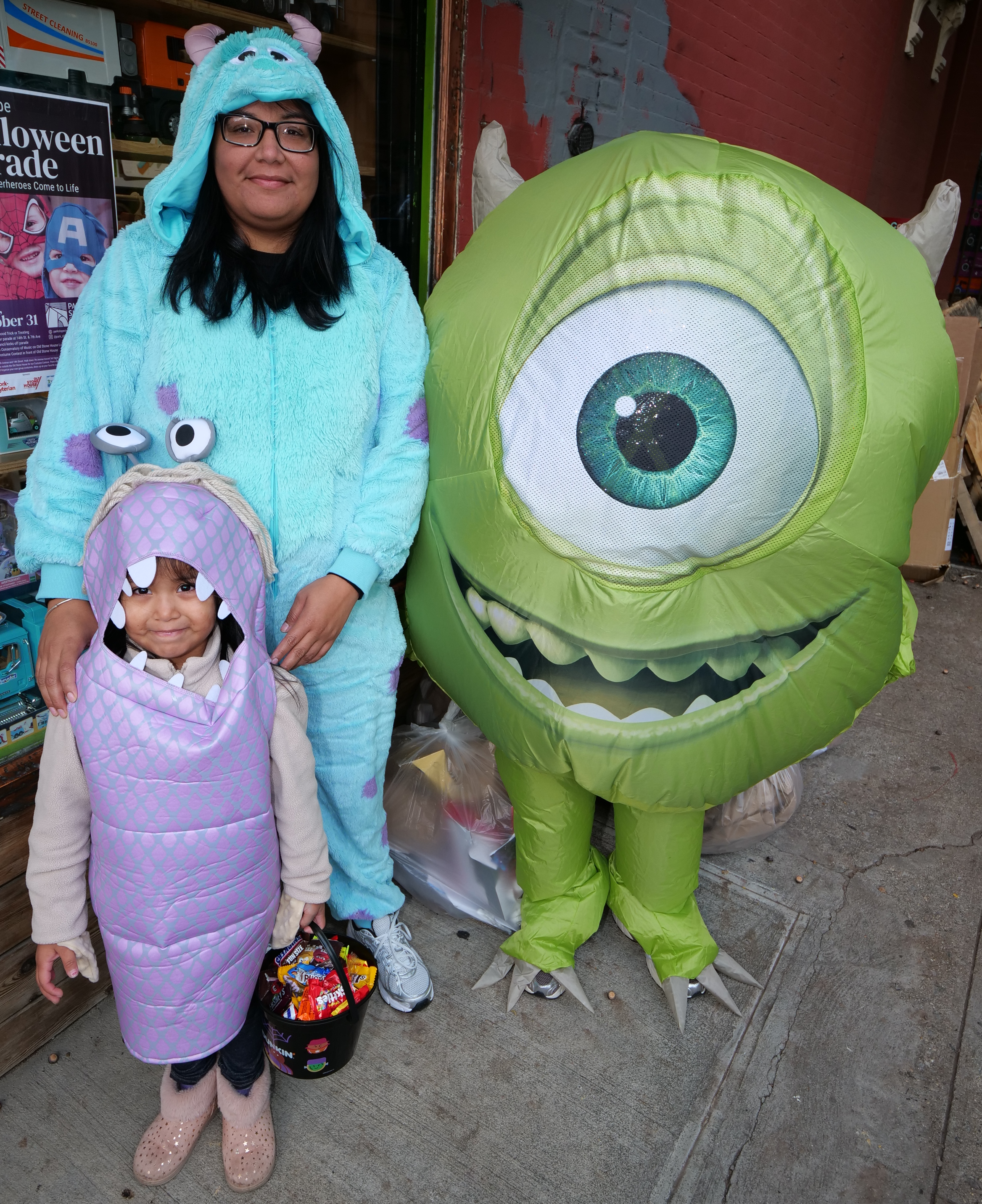 : a little Randall Boggs, James P. "Sulley" Sullivan, and inflatable Michael "Mike" Wazowski