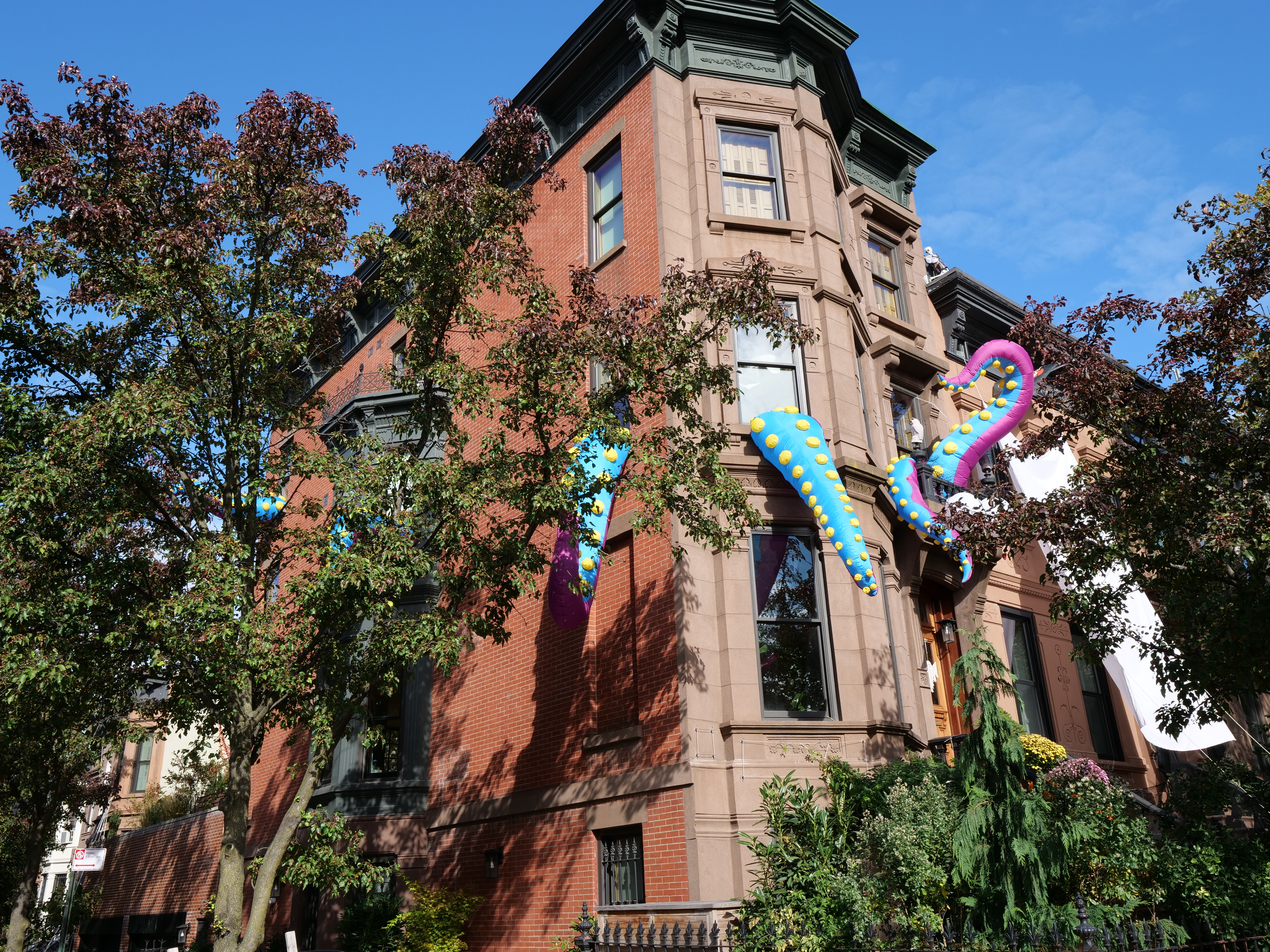 10:47 AM. An octopus coming out of a house at the corner of 2nd St and 6th Ave.