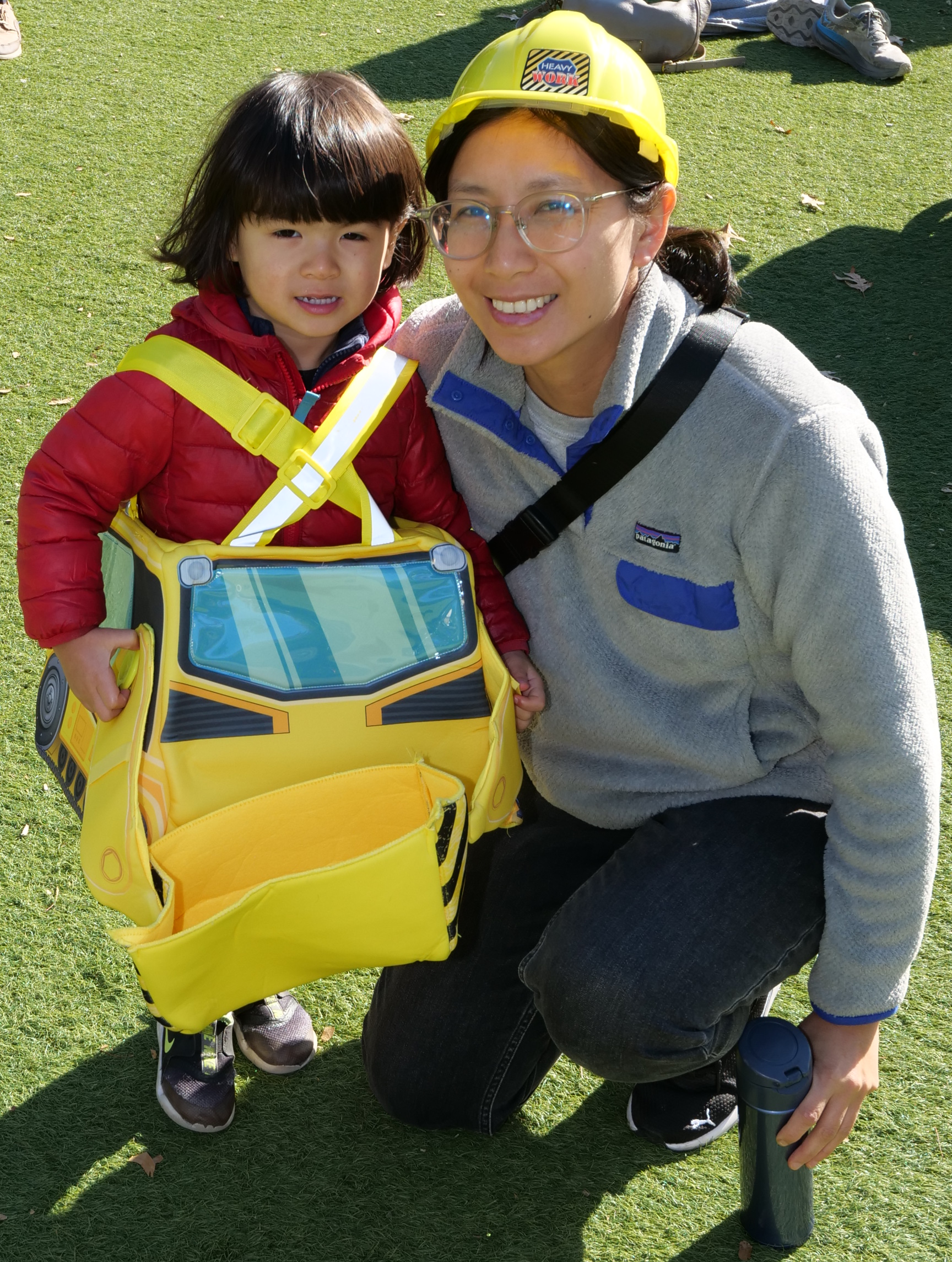 11:05 AM. A Spirit Halloween Ride-Along Bulldozer costume. The bucket can take candy. Mom is wearing the hat that came with the costume.