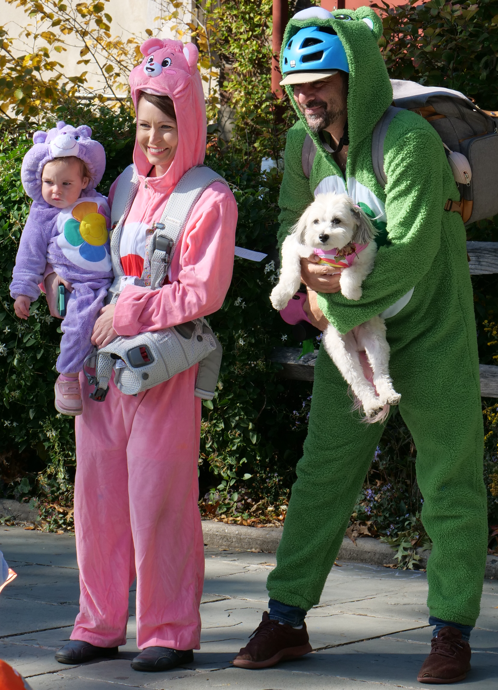 : Flower Power Bear, a pink Cheer Bear, then a green Good Luck Bear. The dog is a Cheer Bear.
